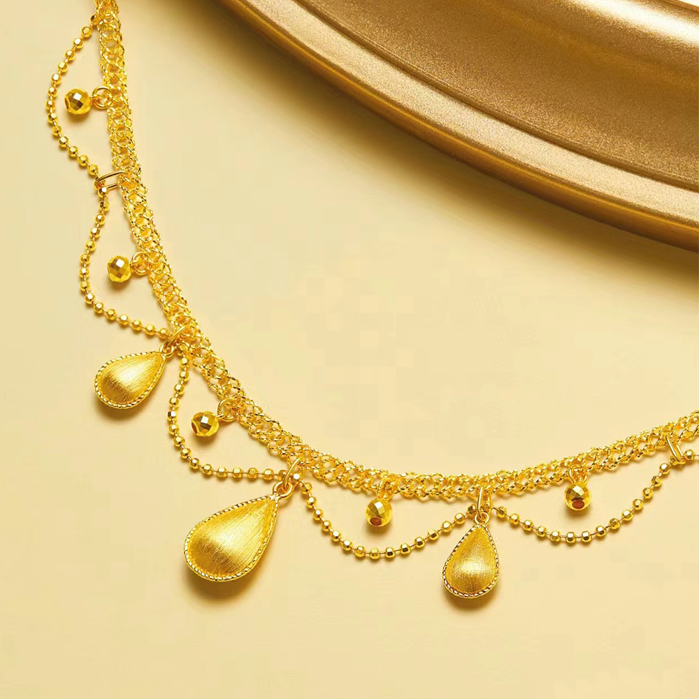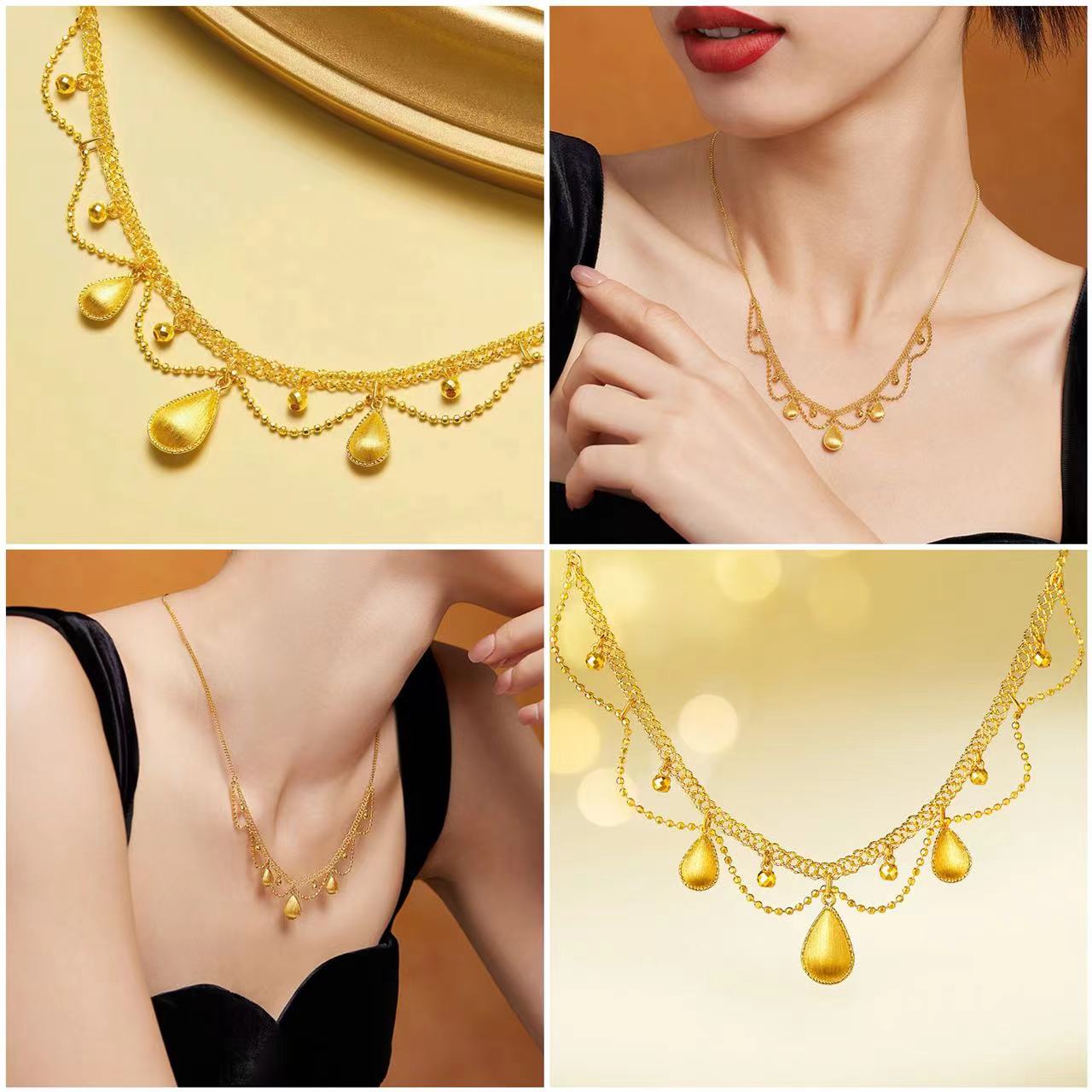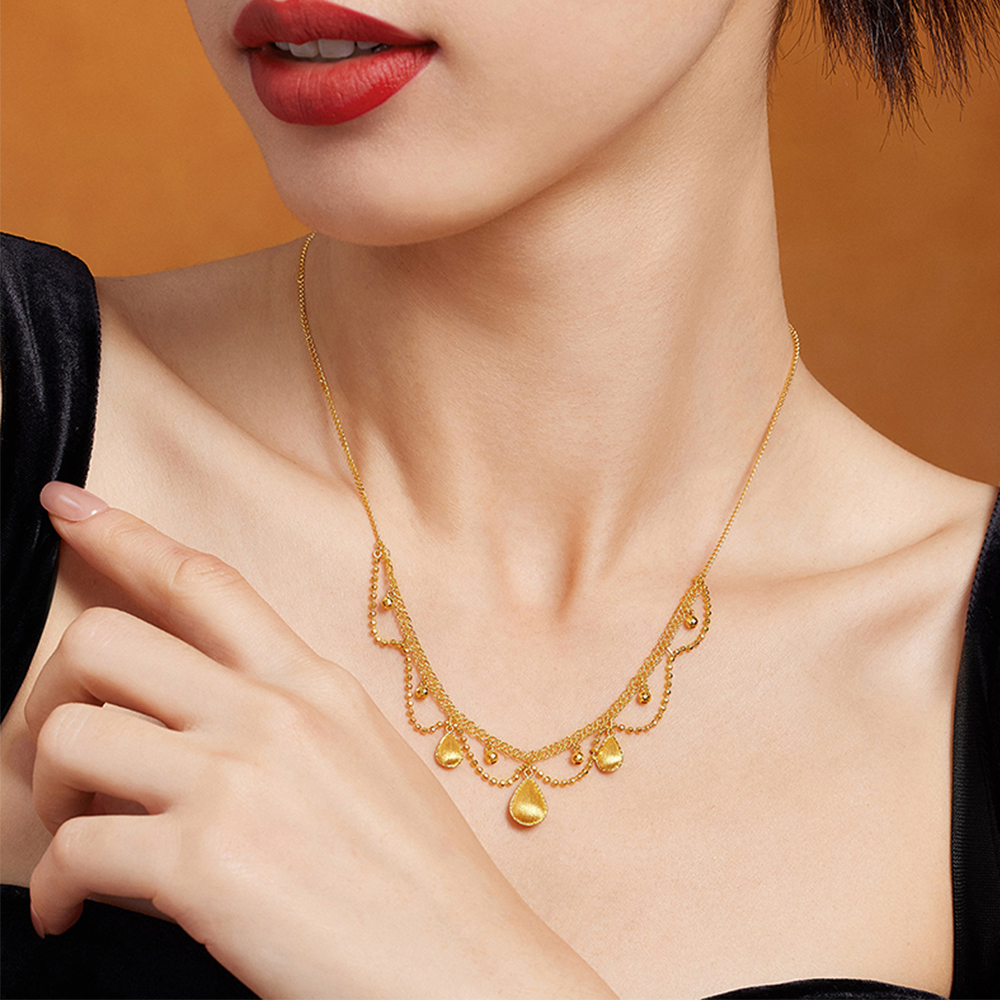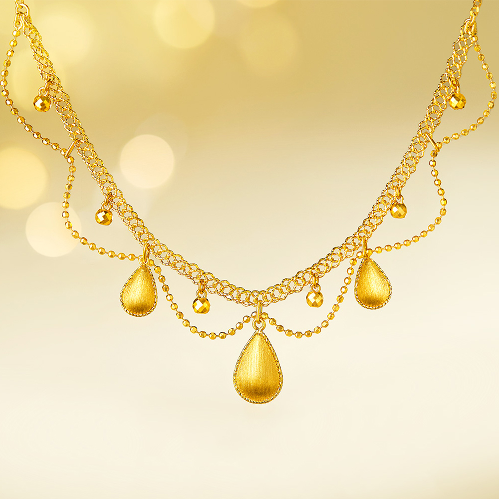 Gorgeous necklace shines brightly around the neck for a glamorous graceful look. The new "Golden Silk" necklace features a draped chain crafted with hand-wound gold wires and double-sided water-drop-shaped gold adornments that float like silk around the neck, exuding enchanting charisma and classical elegance.