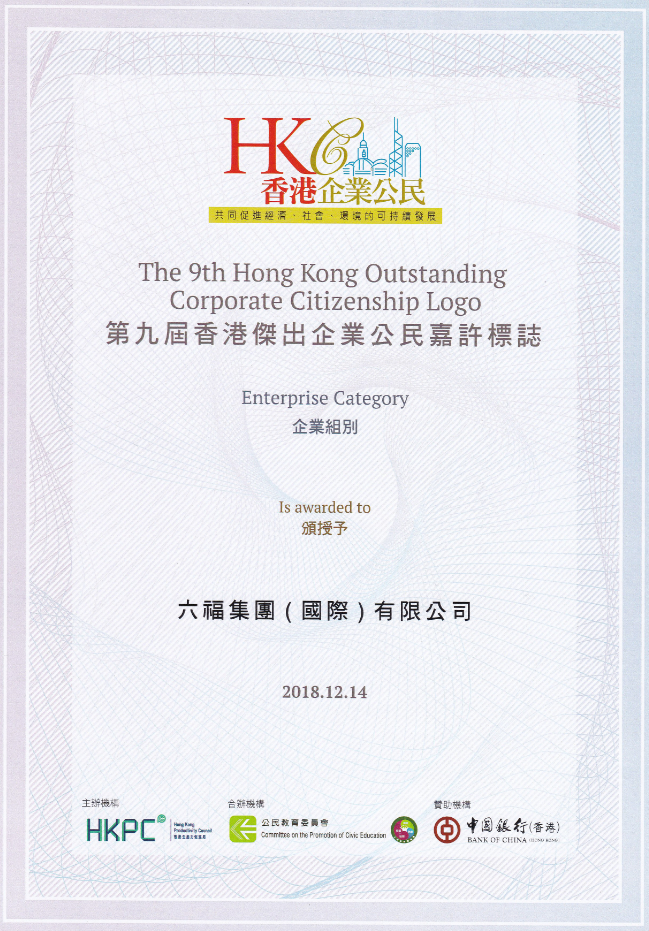 Certificates of “The 9th Hong Kong Outstanding Corporate Citizenship Logo – Enterprise Category” and “The 9th Hong Kong Outstanding Corporate Citizenship Award- Enterprise Category- Special Mention (Community Care)”