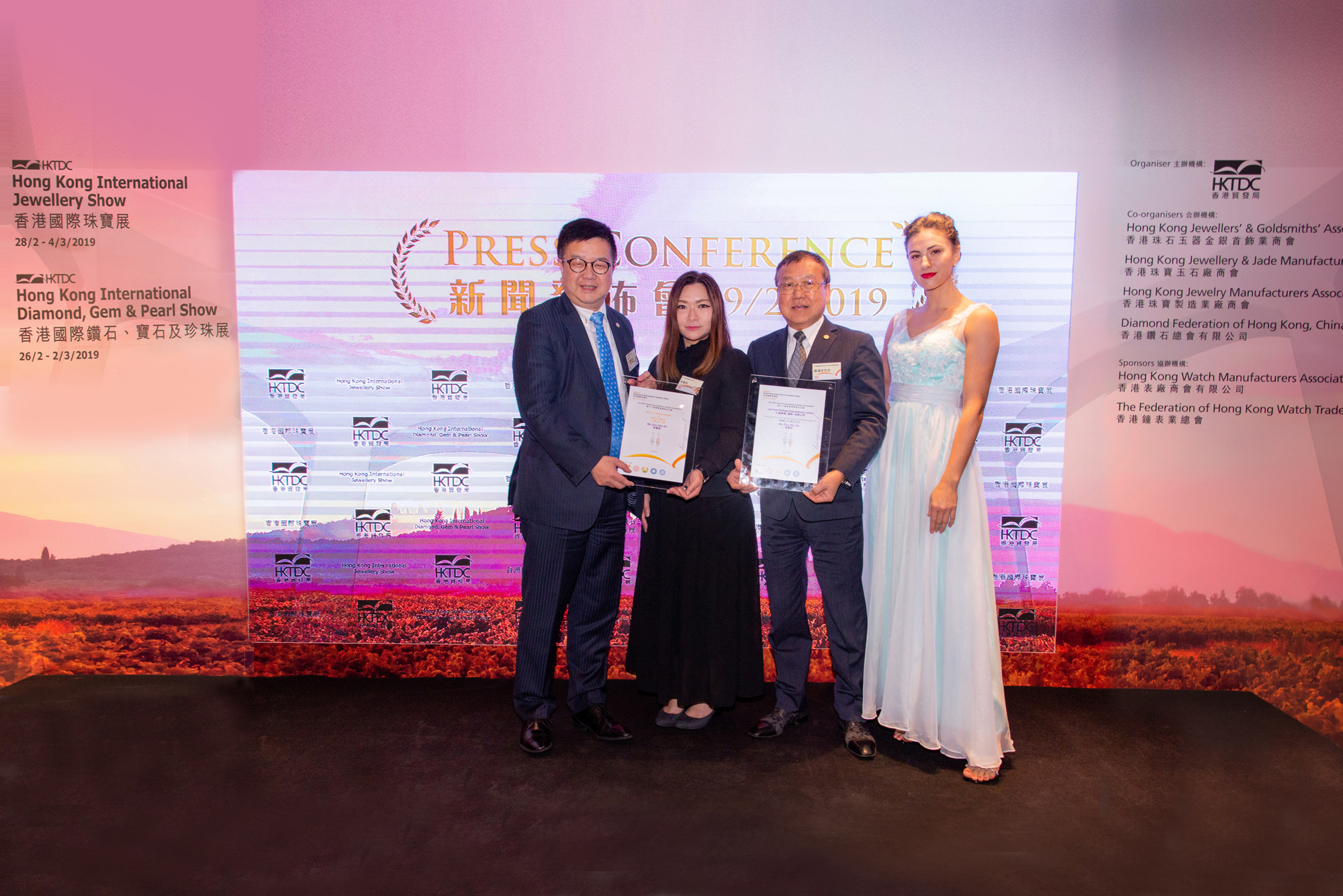 Mr. Tse Moon Chuen, Deputy Chairman and Deputy General Manager of Lukfook Group, and the awardee Ms. Chu Wai On received the award from Mr. Benny Do, Chairman of Hong Kong Jewelry Manufacturers’ Association
