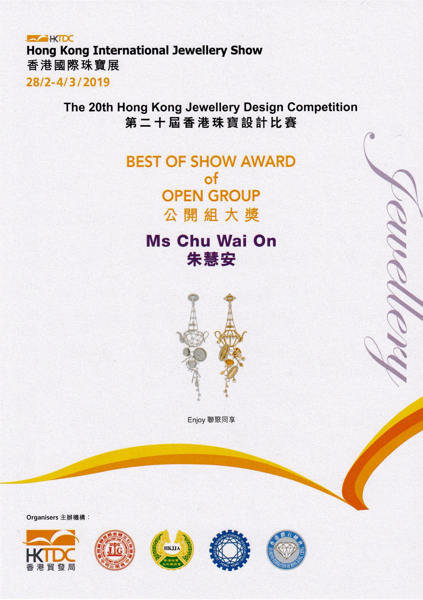 The award certificate of “Best of Show Award (Open Group)” in “The 20th Hong Kong Jewellery Design Competition”