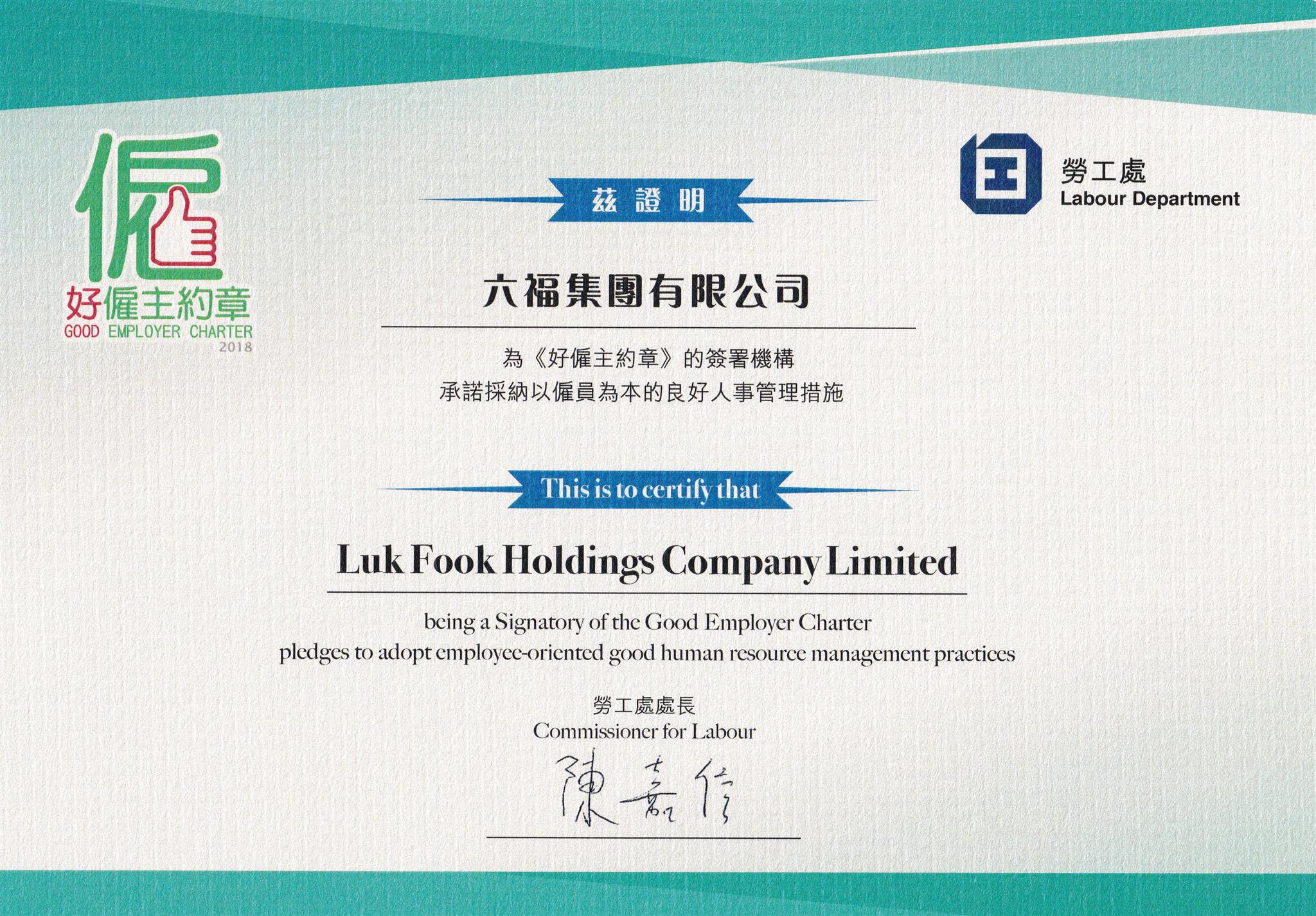 (17 September 2018) — Luk Fook Holdings (International) Limited (“Lukfook” / the “Group”) (Stock Code: 00590) is pleased to announce that the Group is being accredited to be a signatory to the “Good Employer Charter” and awarded the Certificate of the “Good Employer Charter”, proven that the Group values employer-employee relationship and has been paying efforts to promote a good employer culture.