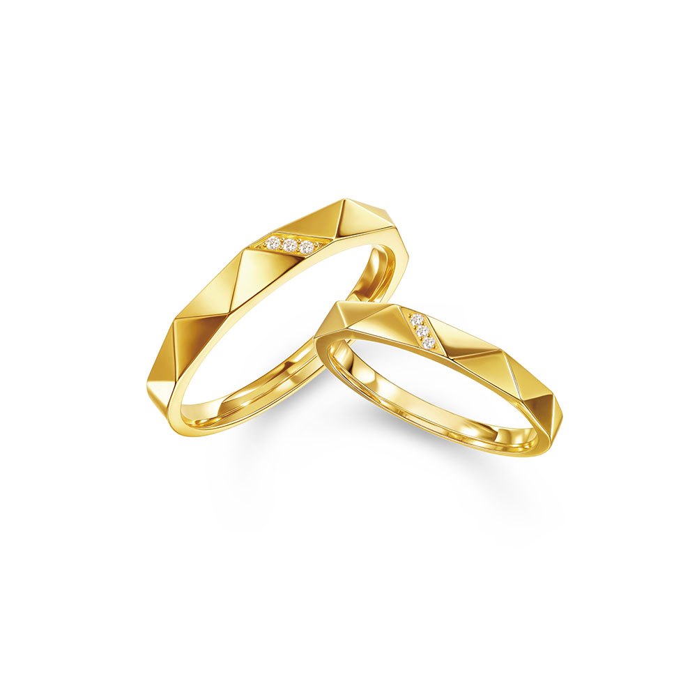 Triangular facets, a symbol of unwavering stability, encapsulate love in an aesthetic geometric design. The rings feature meticulously arranged triangular facets that radiate love from all angles. Sleek lines complement stunning diamonds for everyday sparkle, capturing each moment in your passionate love story. #Also available in a lightweight design in 18K gold with diamonds |