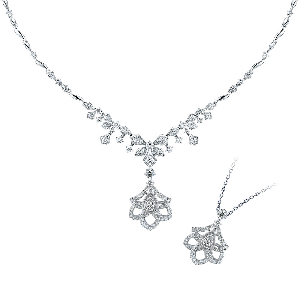 The diamond necklace can be worn alone or mixed and matched with detachable pendant to suit different occasions. |