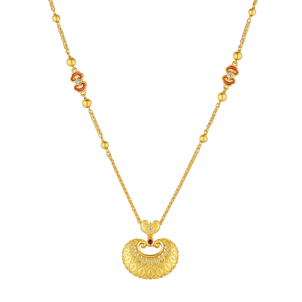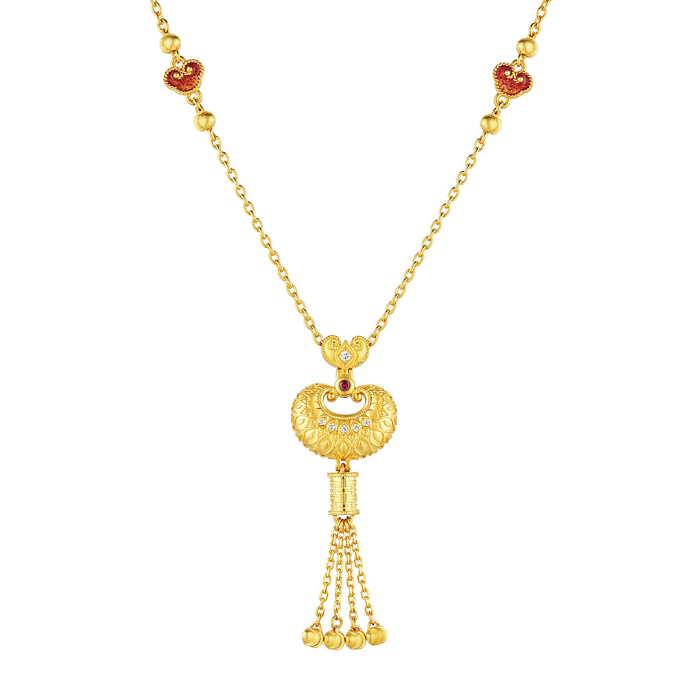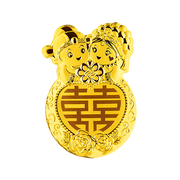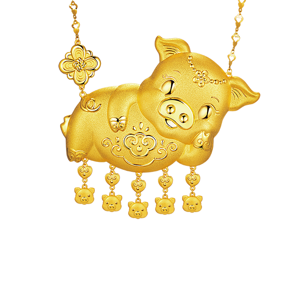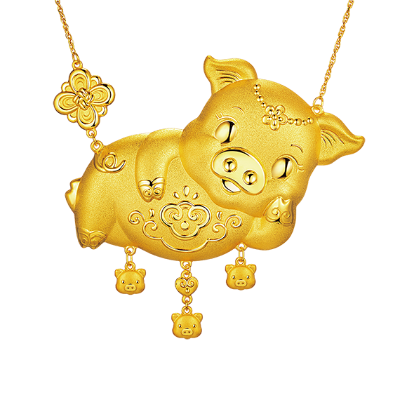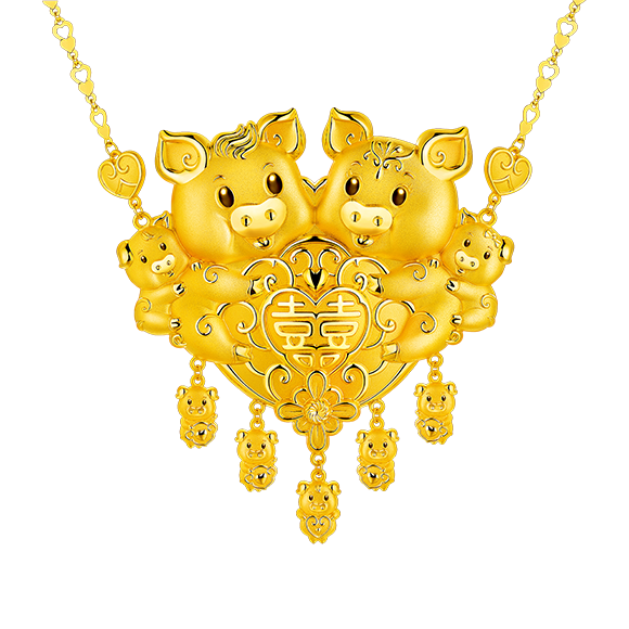 Gold pig is a symbol of happiness and fortune. The three-dimensional necklaces feature the joyful gold pigs of different sizes surrounding the Chinese character "Double Happiness" to form a ruyi motif, or the leisurely lying grinning gold pig, together with a row of cute dangling piglets. The auspicious gold pig necklaces symbolise the wishes for good fortune, affluent life and plentiful offspring.