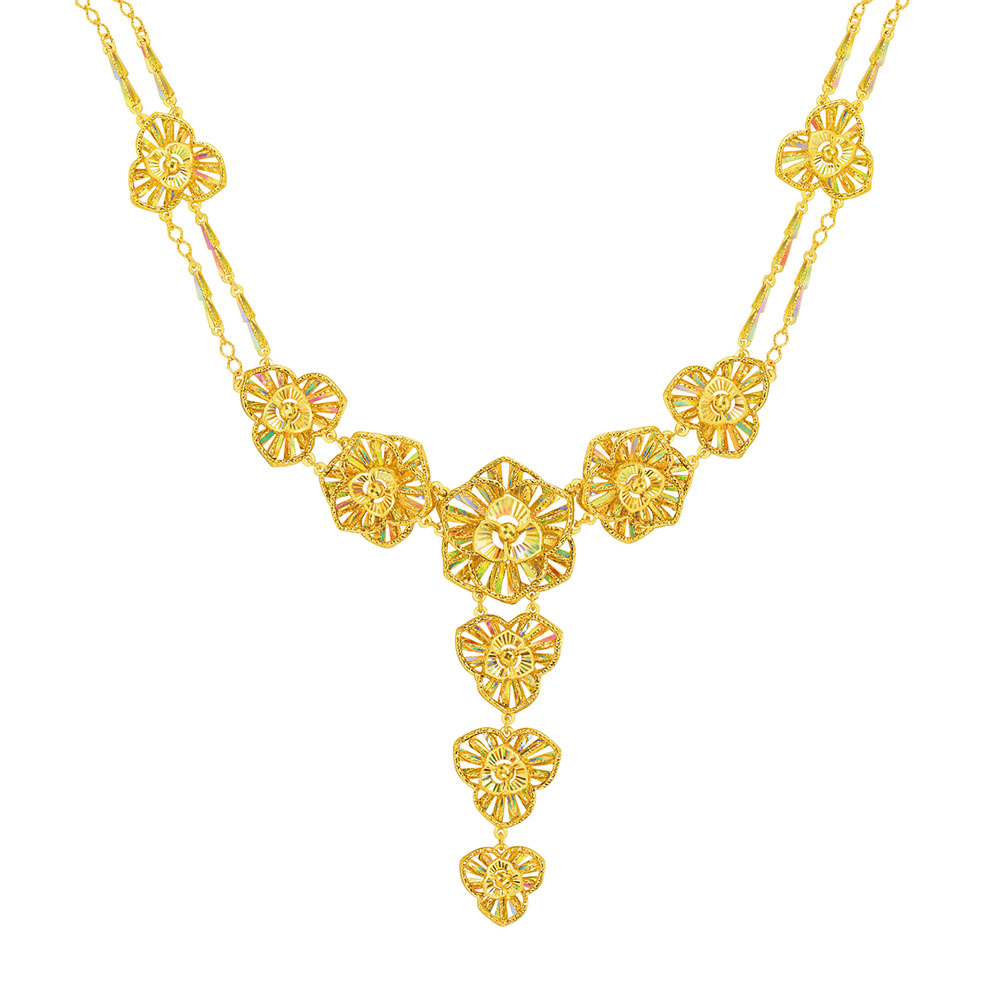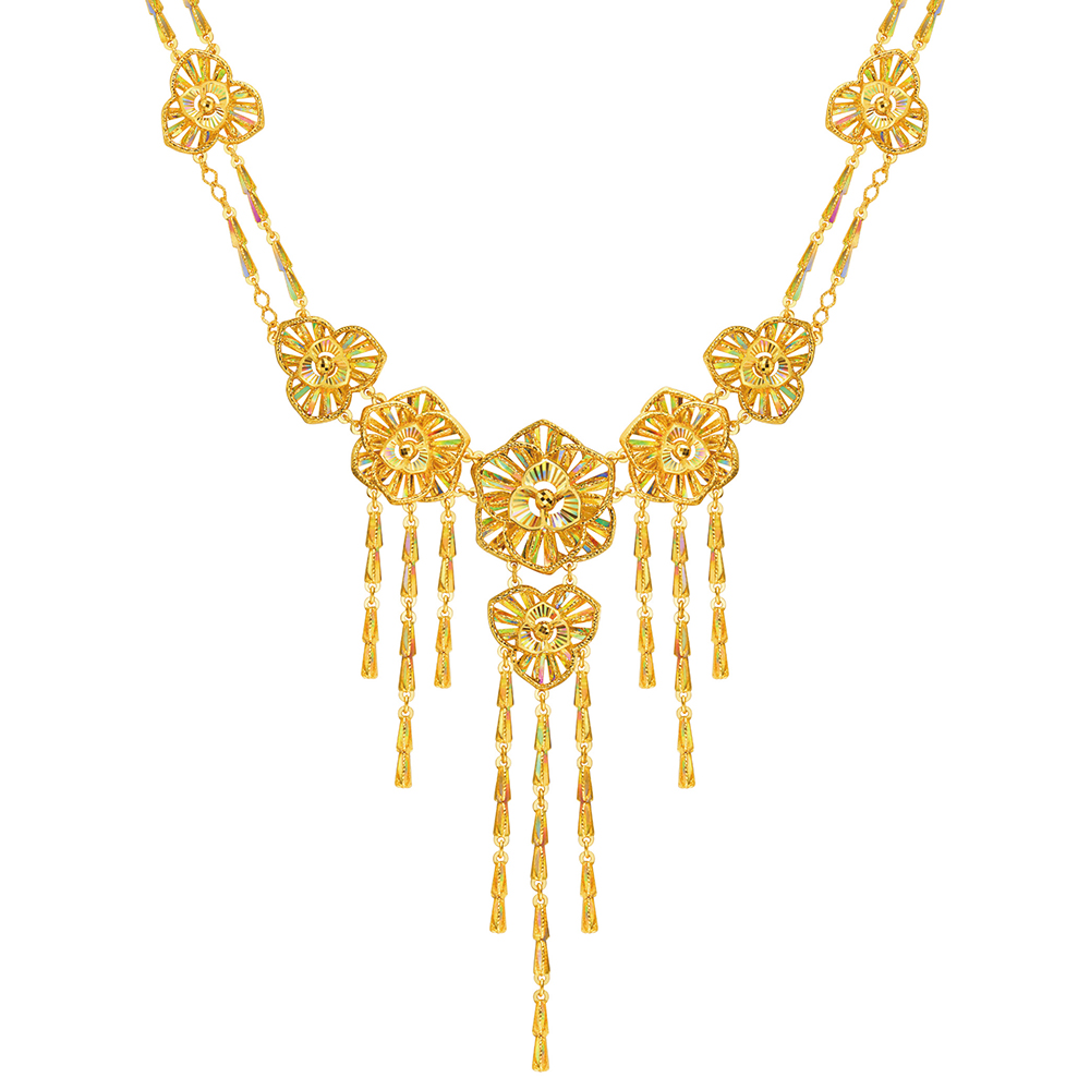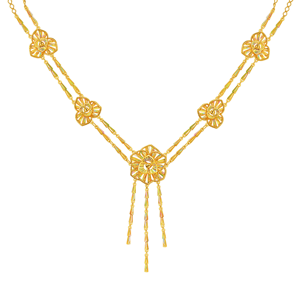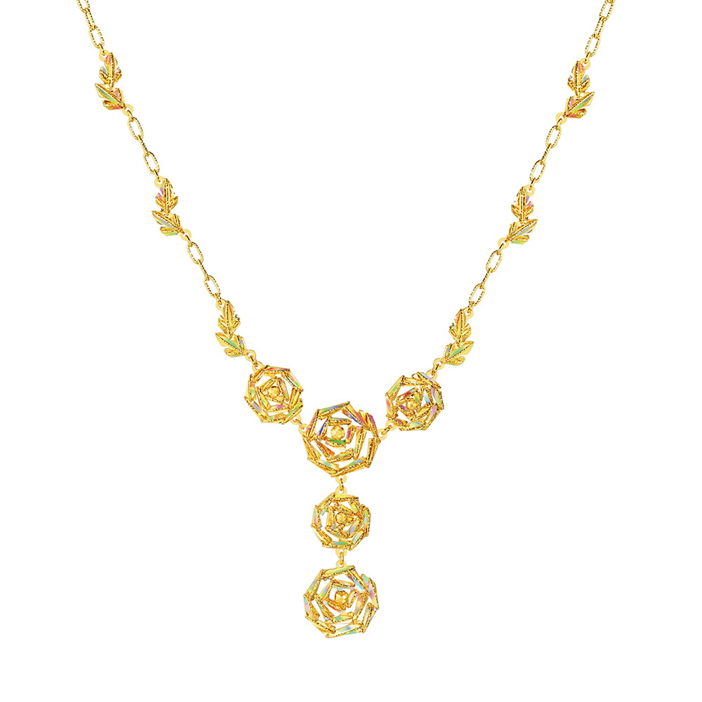 Gold pig is a symbol of happiness and fortune. The three-dimensional necklaces feature the joyful gold pigs of different sizes surrounding the Chinese character "Double Happiness" to form a ruyi motif, or the leisurely lying grinning gold pig, together with a row of cute dangling piglets. The auspicious gold pig necklaces symbolise the wishes for good fortune, affluent life and plentiful offspring.