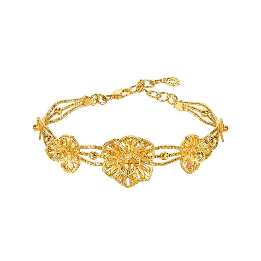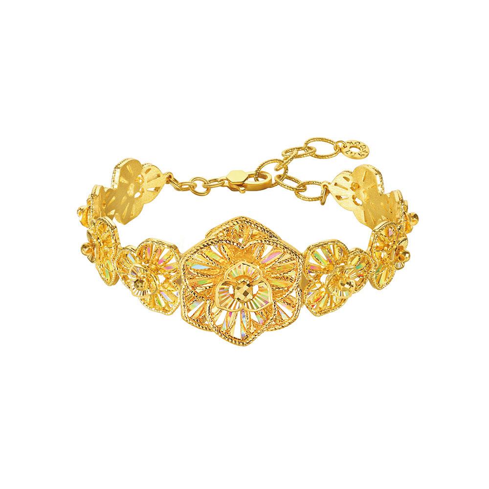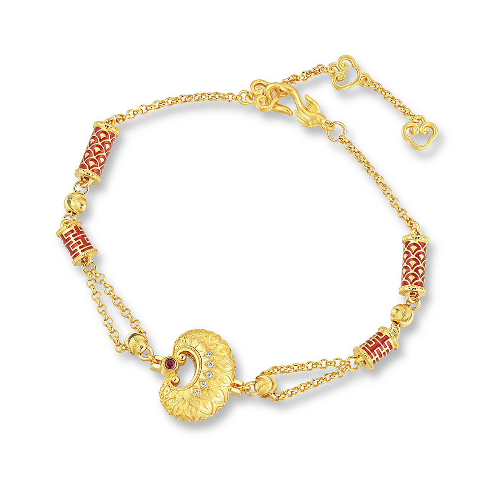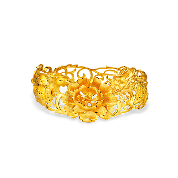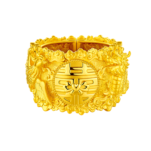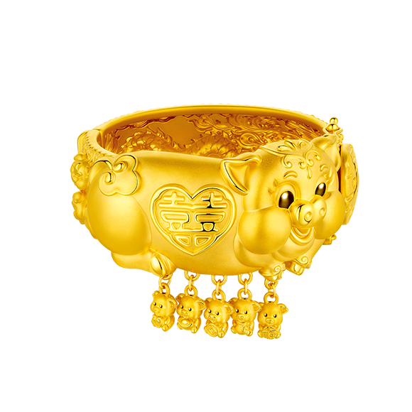 Dragon and phoenix bring forth double happiness, and gold pig heralds good fortune. Dragon scales and phoenix feathers are delicately carved on the gold bangles with the exquisite 5D three-dimensional relief technique. The lifelike dragon and phoenix totems and the Chinese character "Double Happiness" reflect the hope of lifelong happiness and love. The lovely three-dimensional gold pig with tassels of lively piglets invokes the blessings for harmony, happiness and luck.