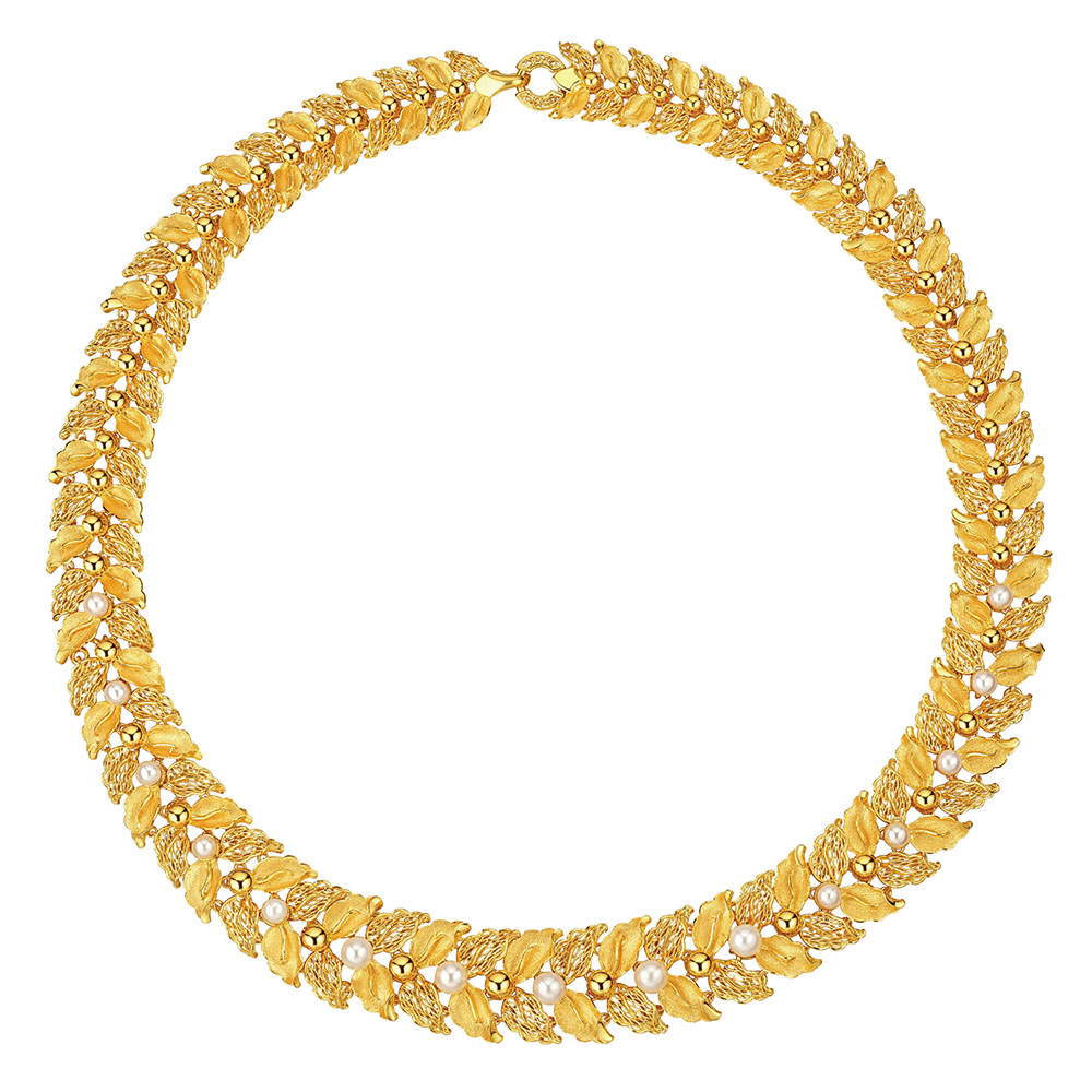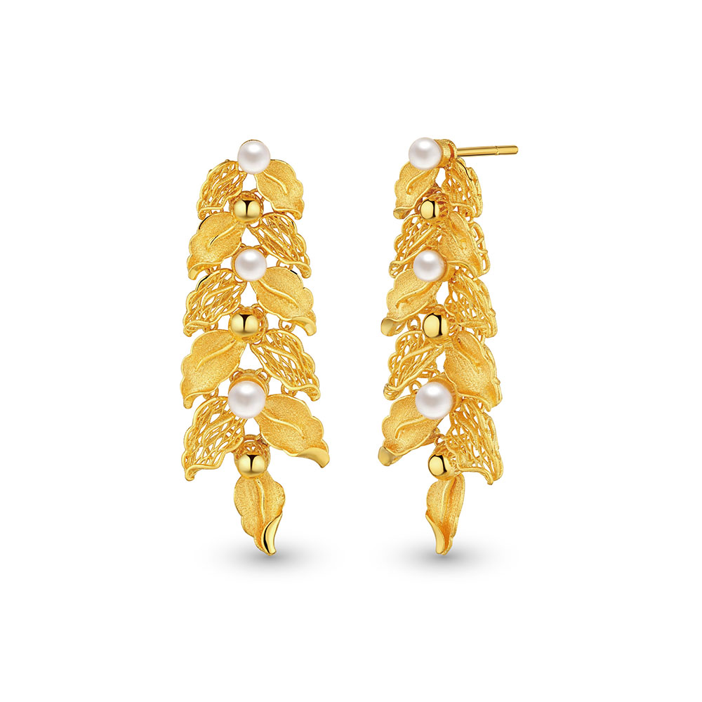 Golden branches and jadeite-like leaves catch the first light of dawn, spreading the message of joy and happiness. Luxuriant laurel leaves, reminiscent of ears of wheat, are incorporated into the jewellery design that embodies the hope for a blissful life. Delicately crafted with 3D printed filigree, each laurel leaf reveals natural textures and veins. Openwork gold leaves are decorated with lustrous pearls to create a gorgeous design that integrates the natural beauty of laurel leaves with the potent symbolism of ears of wheat, conveying the best wishes for enduring love and a happy life.