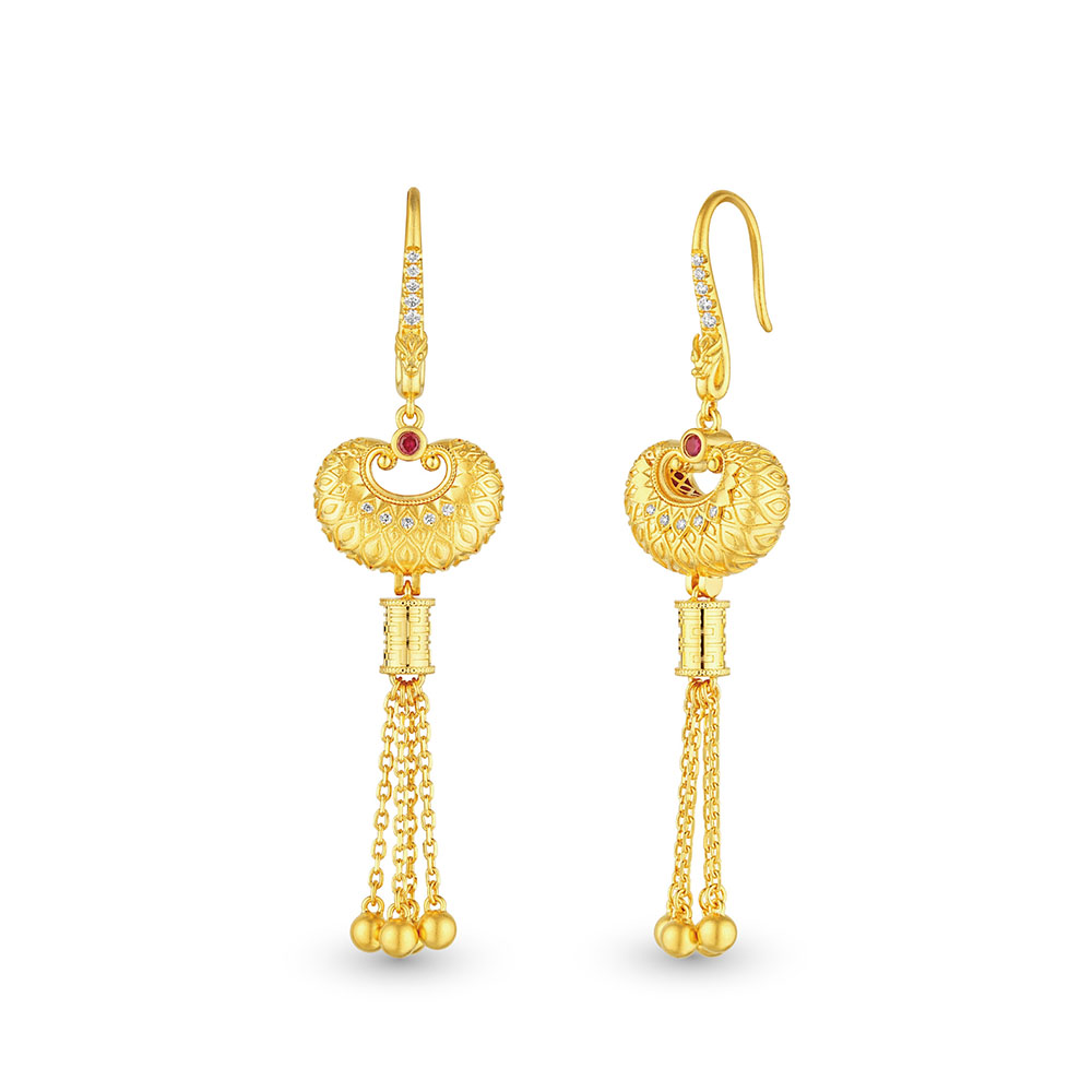 Gorgeous phoenix feathers shimmer to bring good fortune, and gold dragon scales glitter to celebrate a blissful union. The gold lock is decorated with three-dimensional phoenix feather patterns and ruby and diamond accents, and accentuated with dragon scale patterns, "double happiness character" designs and delicate tassels, depicting a propitious scene of a happy marriage. The magpie brings the auspicious date for the reunion. The dragon and phoenix chain clasp binds two souls together for a lifetime. Melding traditional elements with modern crafting techniques, this refined jewellery set adds an elegant finishing touch to the Chinese wedding attire. The auspicious lock conveys the best wishes for eternal love and a blissful life. The large necklace features a detachable left chain which can also be worn as a bracelet for versatile styling.