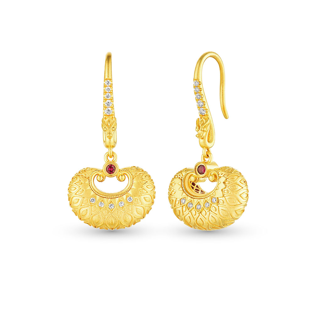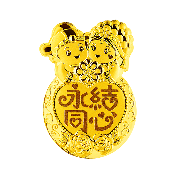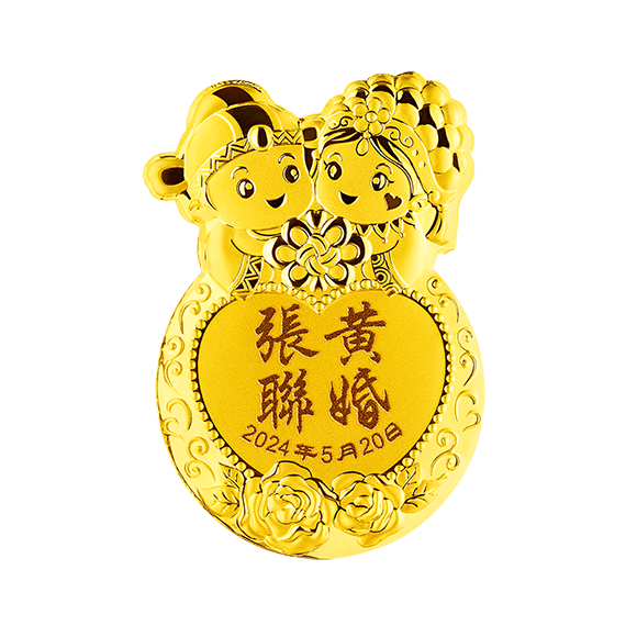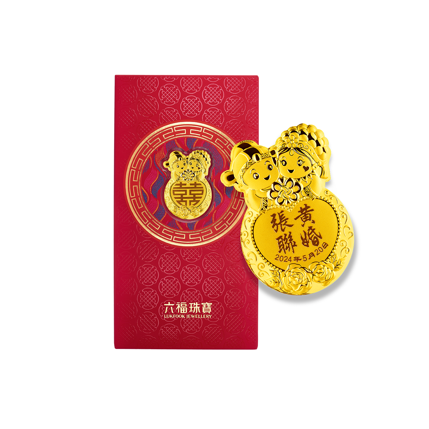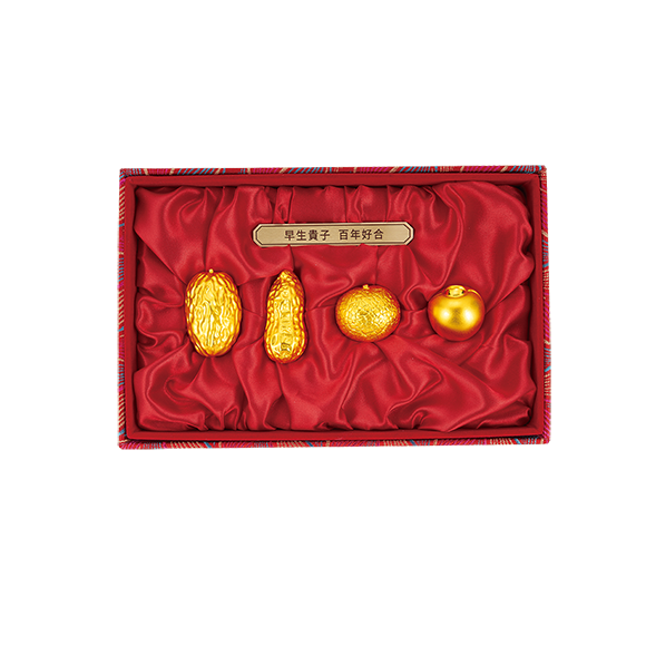 The four symbolic figurines crafted in dazzling gold feature the auspicious red date, peanut, longan and lotus seed. The natural textures and lifelike details are meticulously rendered by skilful craftsmanship. These three-dimensional gold figurines can be held for appreciation. Gift them to the newly-wed couple, wishing them have a lovely baby soon and a happy life.