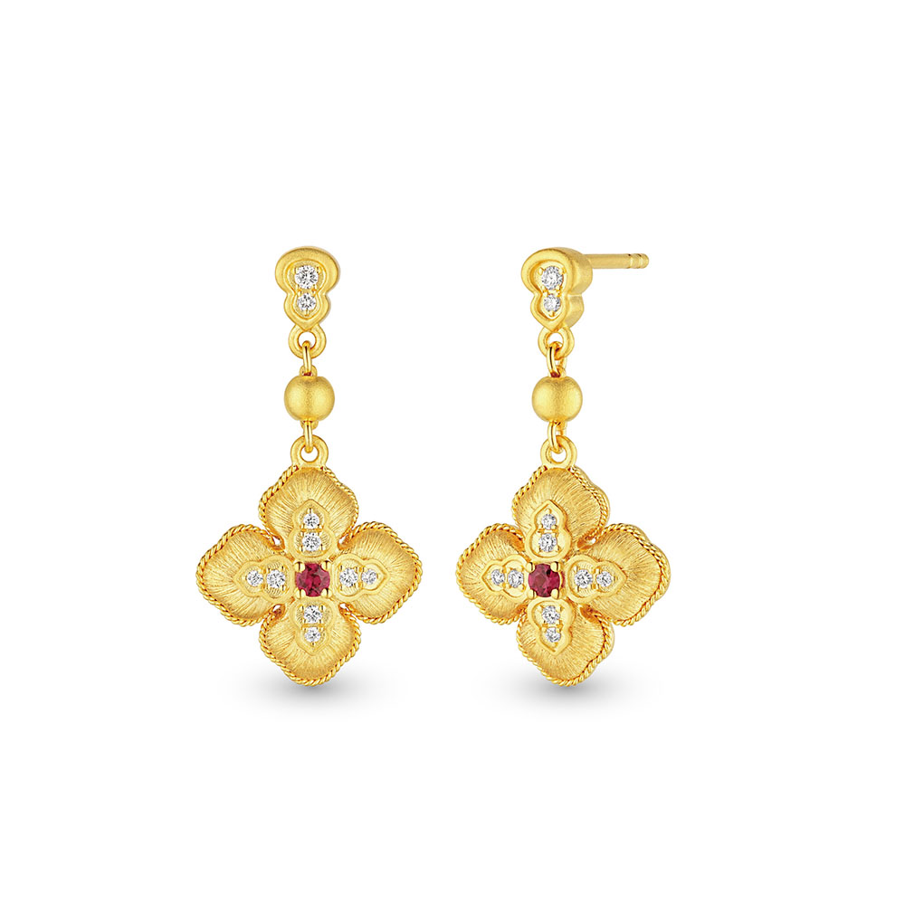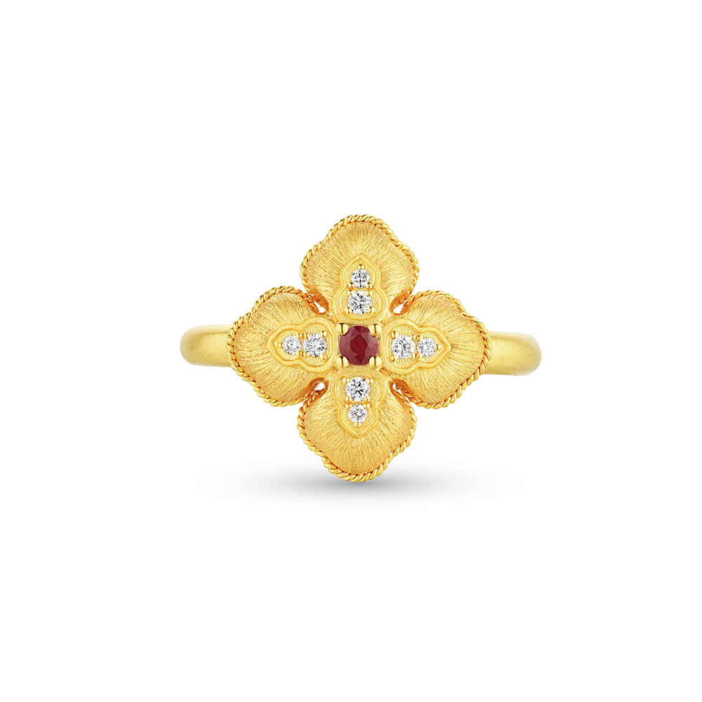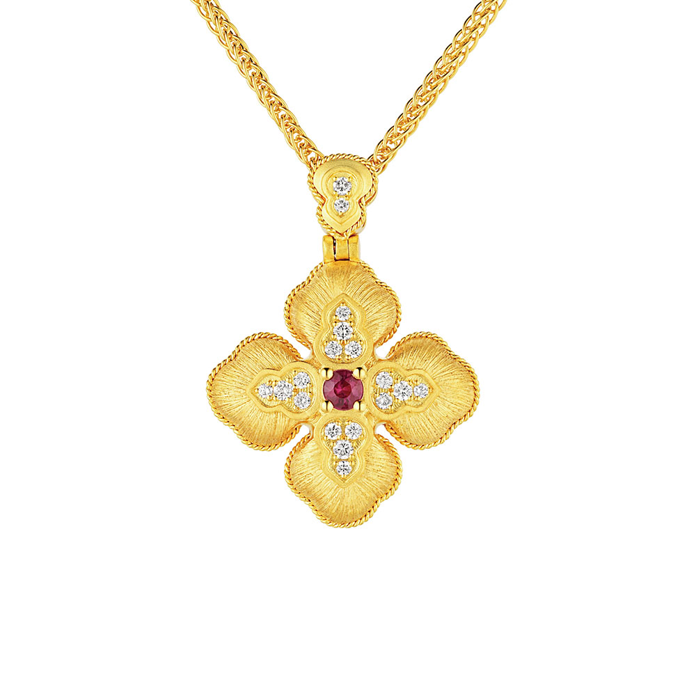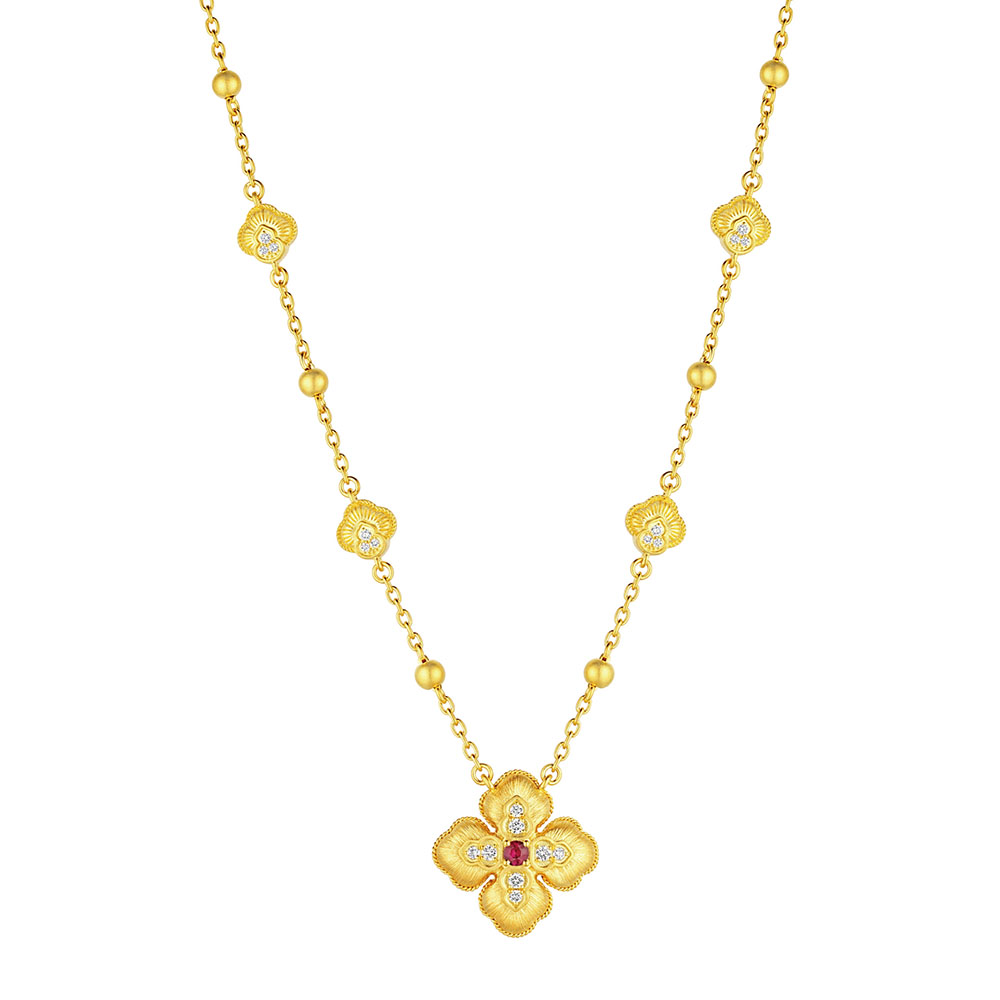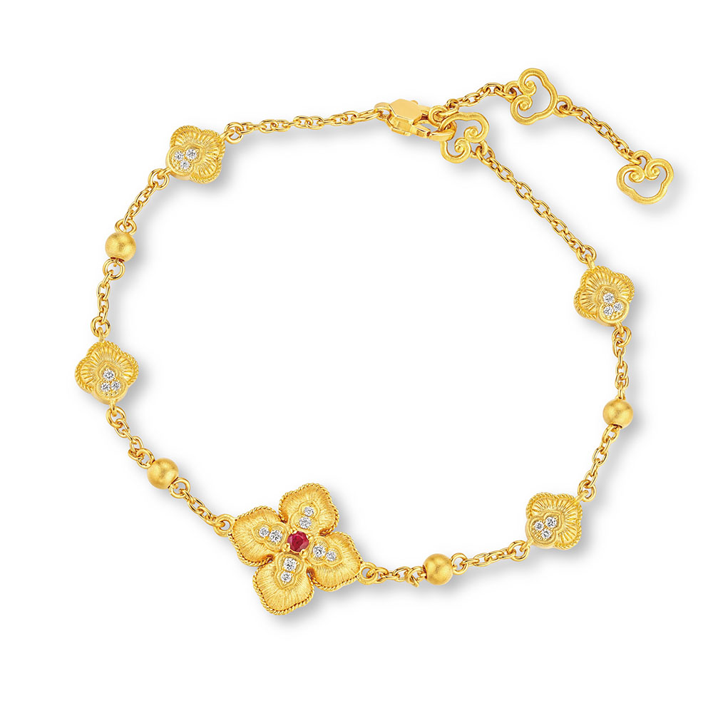Auspicious gourd meets propitious ruyi in a lucky four-leaf clover. The design features a centre ruby surrounded by four diamond-set gourds and four ruyi-shaped clovers, reminiscent of a shimmering dewy four-leaf clover. Soft lines gently trace the contours of clover leaves. Each gourd motif echoes a ruyi motif, perfectly illustrating the distinctive Chinese symmetrical aesthetics. Gourd conveys the blessings for fortune and prosperity, and ruyi wishes you a smooth journey of life. Four-leaf clover brings you good luck. The auspicious symbols of the East meet the lucky clover of the West to create the timeless, poetic design.