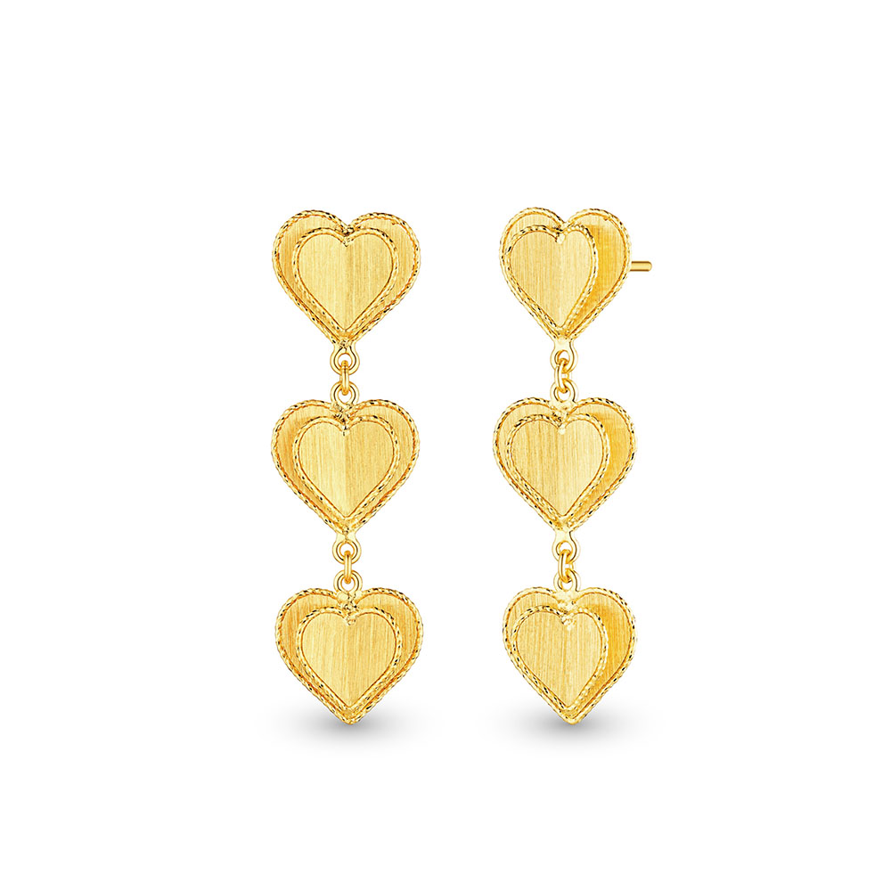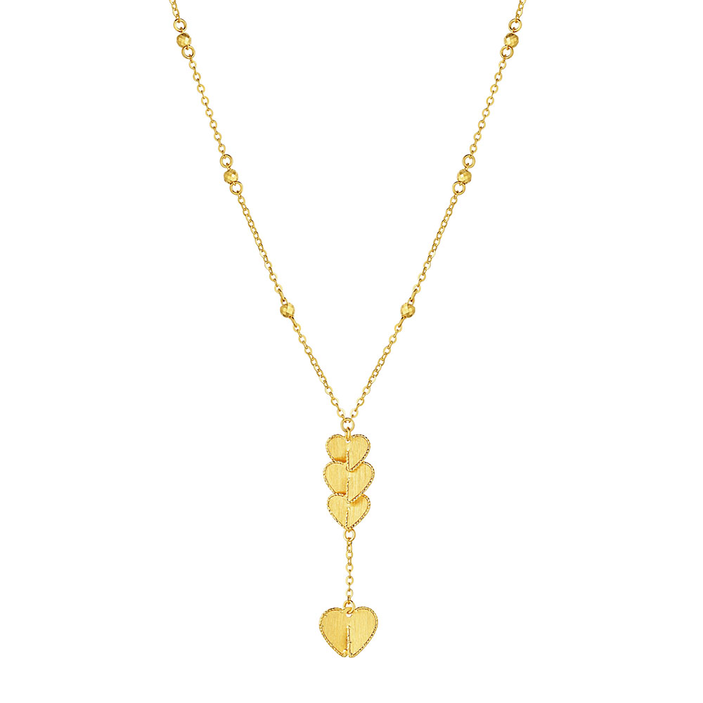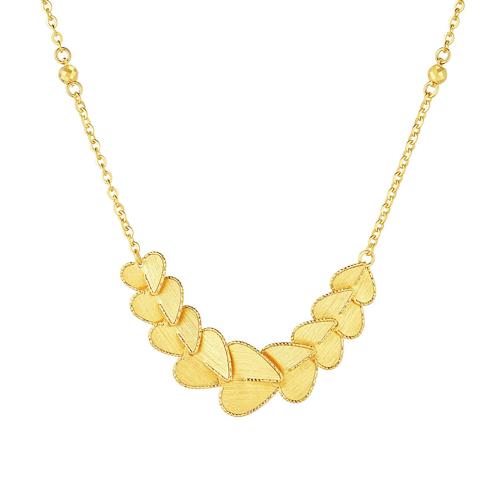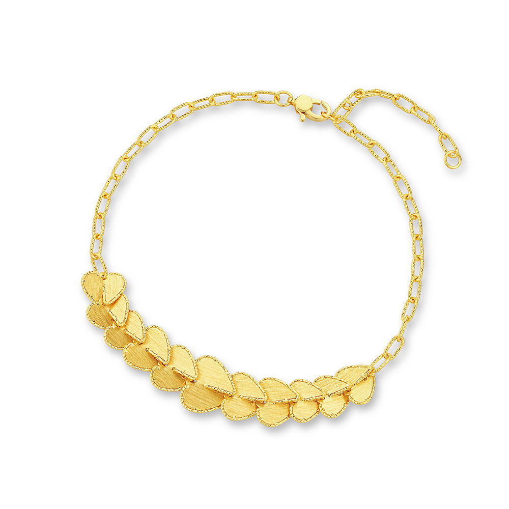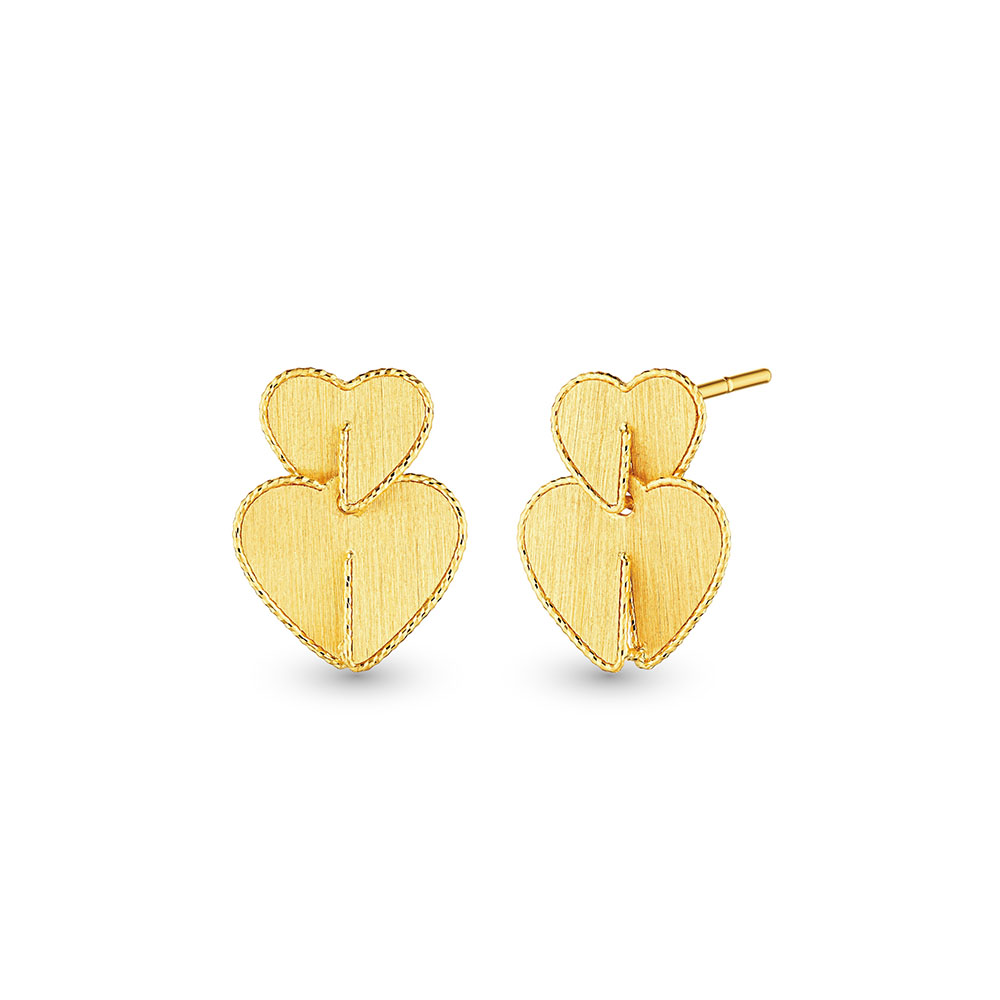 Gold threads trace the outline of love from the heart. This jewellery set features a mix of hearts with delicate brushed finish, resembling the ripples of love stirred on the lake of heart and capturing the heartbeat of love. The fine brushed surface glows like silk. The light and elegant design is versatile enough to suit a sweet look, match a cool style, and complement vintage glamour. Each gold thread is delicately crafted to weave a sweet love story that whispers the message of happiness and warmth.