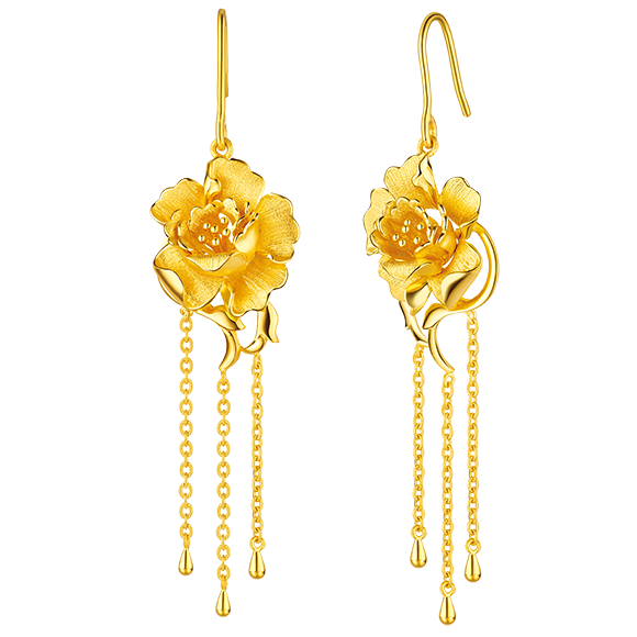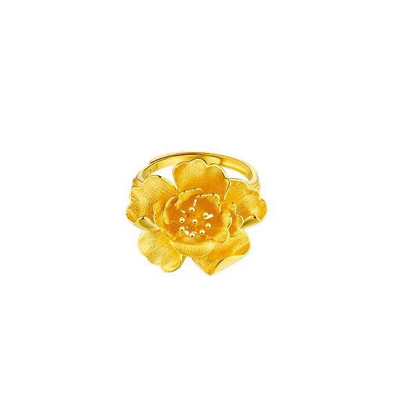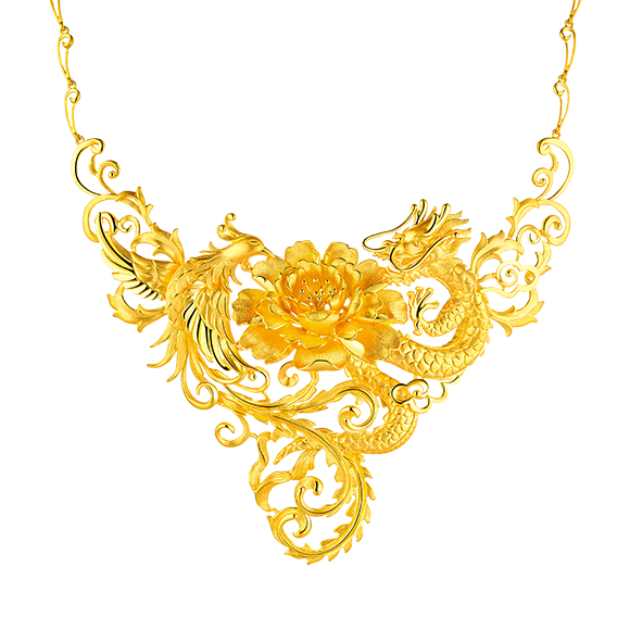 Dragon and phoenix is a symbol of harmonious marriage. Flowers bloom for prosperity. The designer depicts the lifelike details of the auspicious dragon and phoenix with dazzling gold, and carves the delicate textures of beautiful peonies to complement the bride's vivacious beauty and sophisticated elegance. This sparkling gold set reflects the hope for a long, happy marriage and everlasting love.