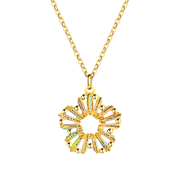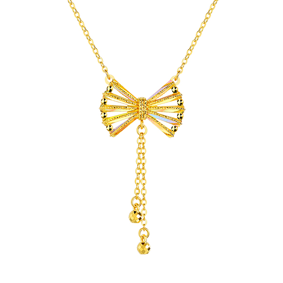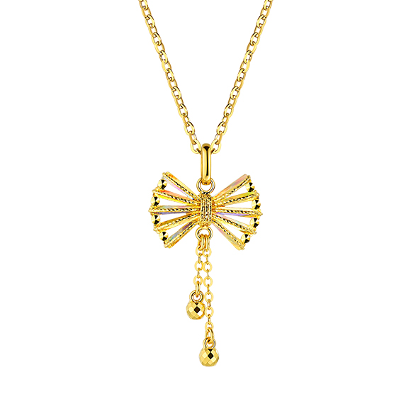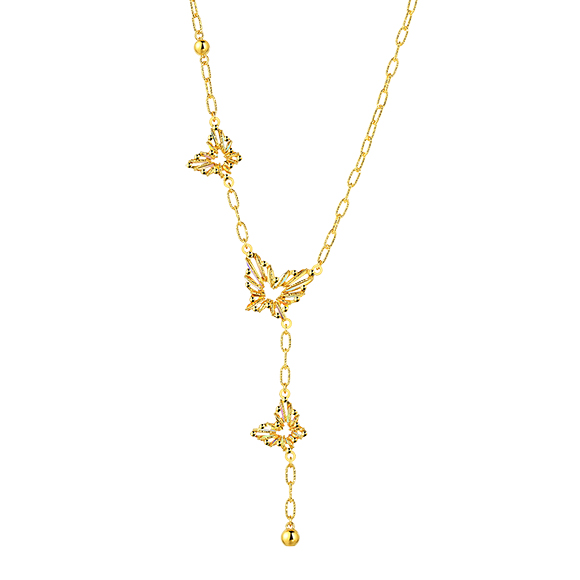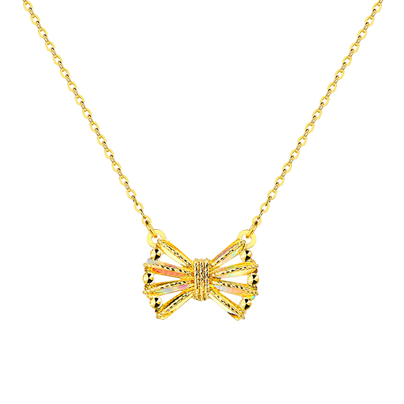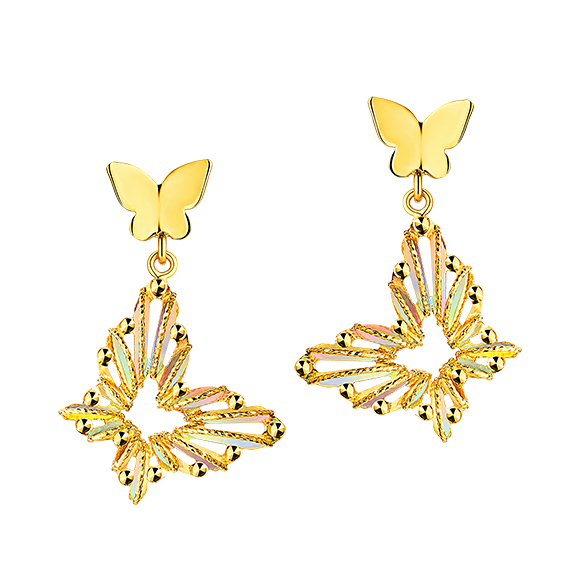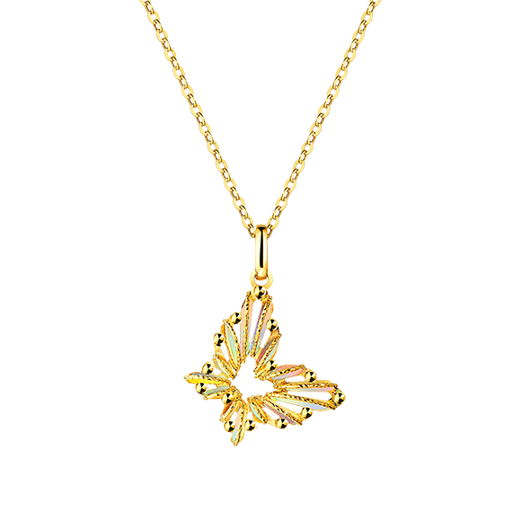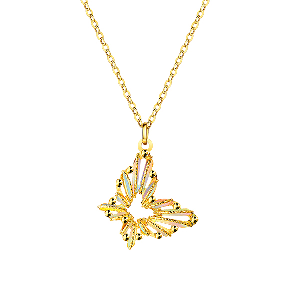 The butterfly motif is regarded as an auspicious symbol of good luck as "butterfly" in Chinese sounds like "fortune piles up", representing continuous good fortune and accumulation of blessings. Beautiful butterflies spreading their wings are brought to life in the lightweight openwork designs. The new-generation of radiant colours finish creates gradient iridescence on the gold carved facets, capturing the grace and vitality of fluttering butterflies amidst the interplay of light and shadow. The necklace and pendant can be worn double-sided. Radiant iridescence adds a dash of ethereal sparkle. Be it for personal wear or as a gift to your loved ones, each piece of this selection is perfect for conveying heartfelt blessings.