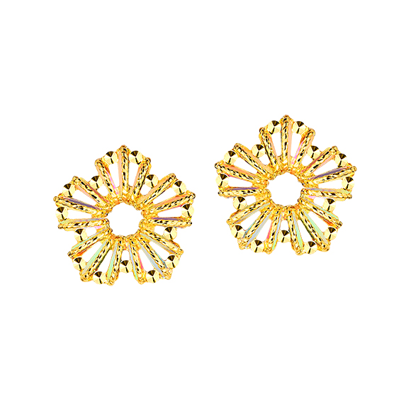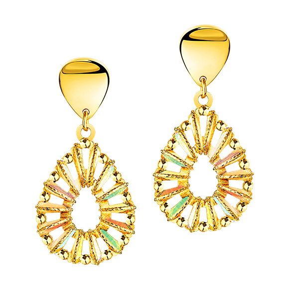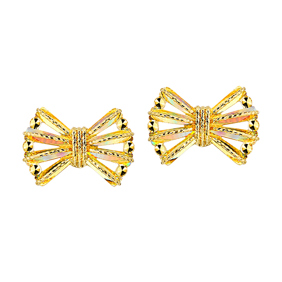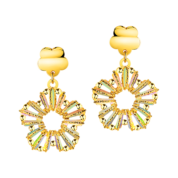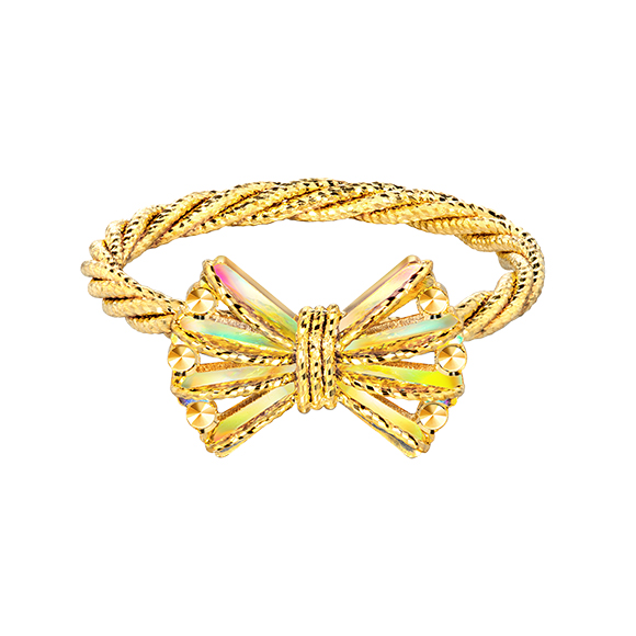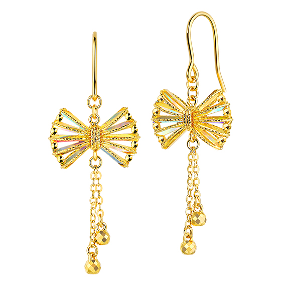 Expressing holiday blessings in a joyful way is like the bow on the gift, condensing precious thoughts and carrying warmth and love. Soft curves and elegant knots reflect the femininity and vivacity of women. The radiant colours finish creates splendid iridescence in the three-dimensional carved lines and openwork bows. Gold carved facets glitter like the colourful ripples in the shimmering love river. Two gold balls of different lengths sway gently, telling your unique love story. Some pieces can be worn double-sided to create two different styles.