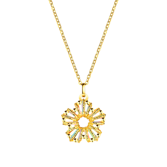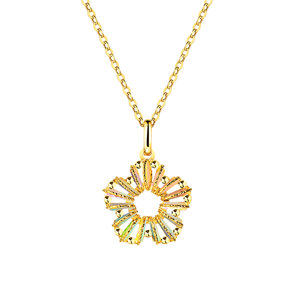 Peach blossoms have always been a symbol of romance and beauty. Inspired by the blooming peach blossom, the design features a radiant openwork peach blossom outlined with three-dimensional carved lines. Gold carved facets radiate iridescent splendour, adding extra sparkle to the sweet, pure blossom. The necklace and pendant can be worn double-sided. Radiant iridescence adds a dash of ethereal sparkle. May the blooming peach blossoms bring you love and happiness.