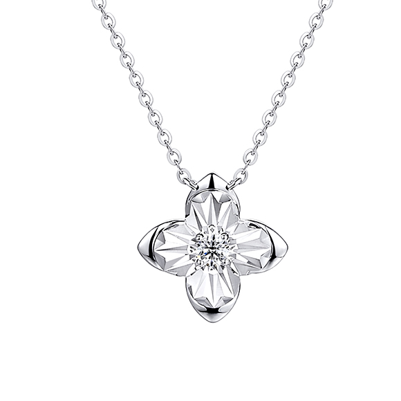 Sparkling natural diamond is combined with lustrous 18K gold to create an elegant and sweet look. The design captures the beauty and grace of a blossoming flower outlined with stylish metal cut patterns. Accentuated with a glittering natural diamond in the centre, the radiant necklace blooms like an exquisite flower around the neck, adding a touch of romance to the sweet Valentine's Day. May true love bloom forever.