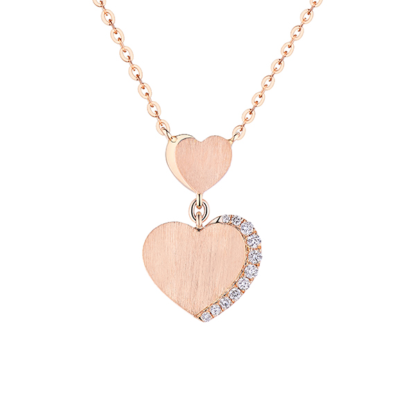Celebrate the beauty of love with this sweet heart-shaped design that represents the bonds of love. The necklace sways gently around the neck with every heartbeat, whispering the vow of love. Hearts with delicate brushed finish are evocative of the resilience of love. Glittering natural diamonds are set along the edge on one side of the heart, radiating distinctive glamour. Two connected hearts evoke the appeal of love that draws two persons closer to each other. This romantic piece shines with the light of love it is witness to.