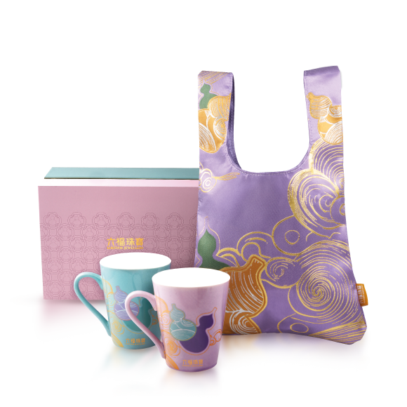 Lukfook Jewellery offers a special heartfelt gift set for the Valentine's Day. The gift set features the romantic purple and sky blue colours, exuding sophisticated elegance. The upper layer of the gift box holds a matching handbag decorated with golden thread embroidery of auspicious cloud patterns and gourd motifs, which symbolise "fortune and prosperity". The purple and green couple mugs in the lower layer feature the gourd motifs rendered with delicate high-temperature firing process, evoking the serene poetry in Eastern culture. These mugs are an exquisite blend of aesthetic lifestyle and traditional culture, making a heart-warming gift to convey sincere wishes. Bring home this love-infused gift to share happiness with your loved one this Valentine's Day.