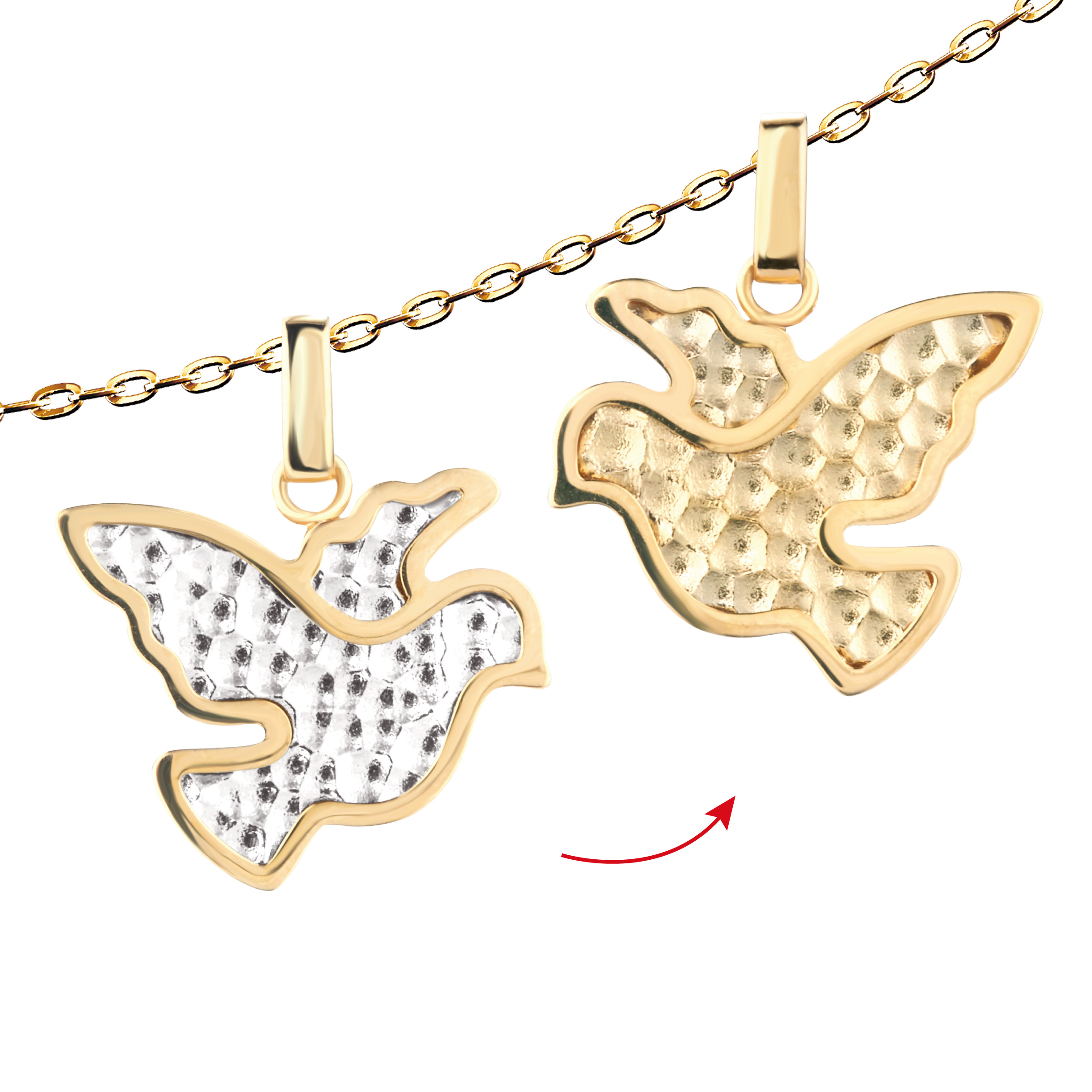 The flying dove is embellished with hammered finish to accentuate the three-dimensional effect. Stylish two-tone design adds on-trend sparkle to this double-sided pendant.