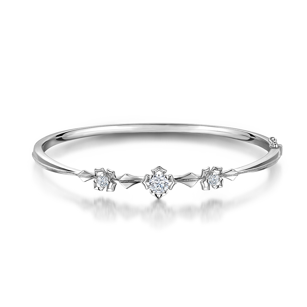 Flowers nourished with love radiate sparkling beauty. The timeless flower with gorgeous diamond stamens and enchanting openwork petals makes a statement of everlasting love between a couple. 18K gold and pure diamond complement each other to shine brightly in the light. Milgrain design adds elegant delicacy to the diamond bangle and bracelet.