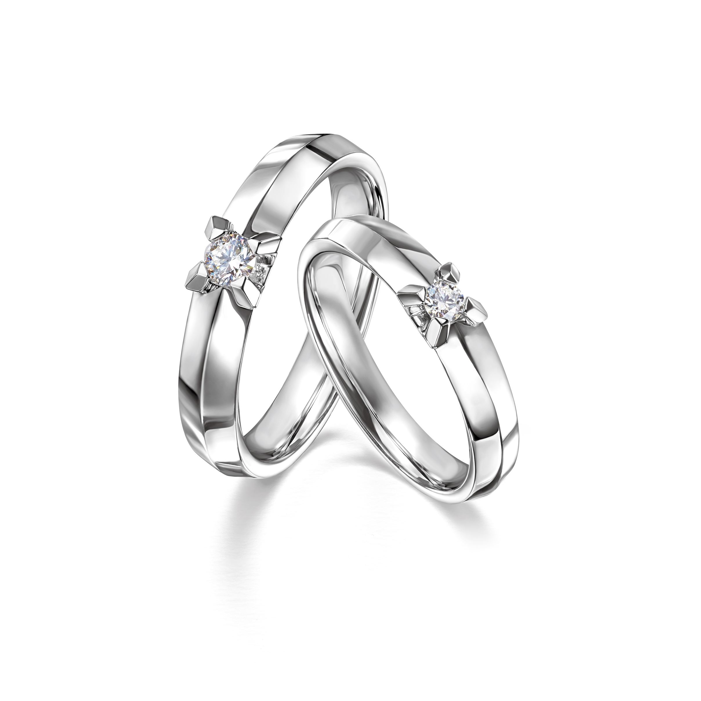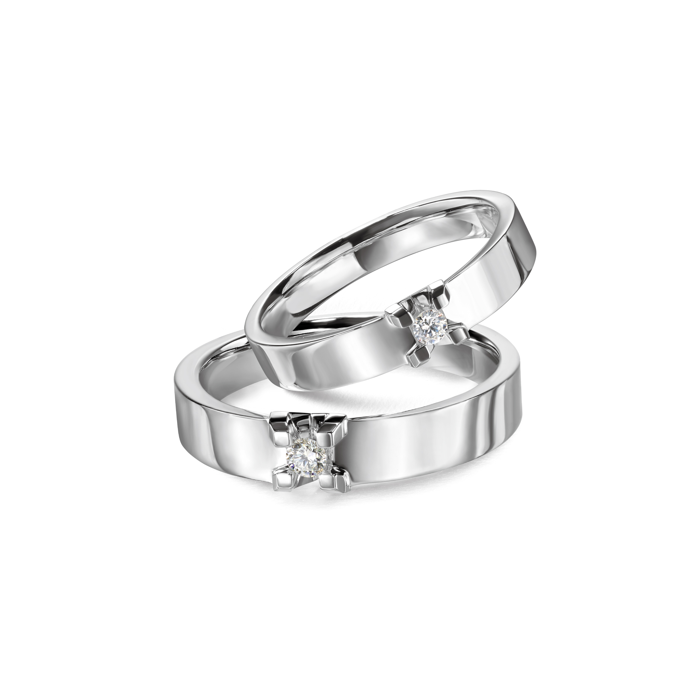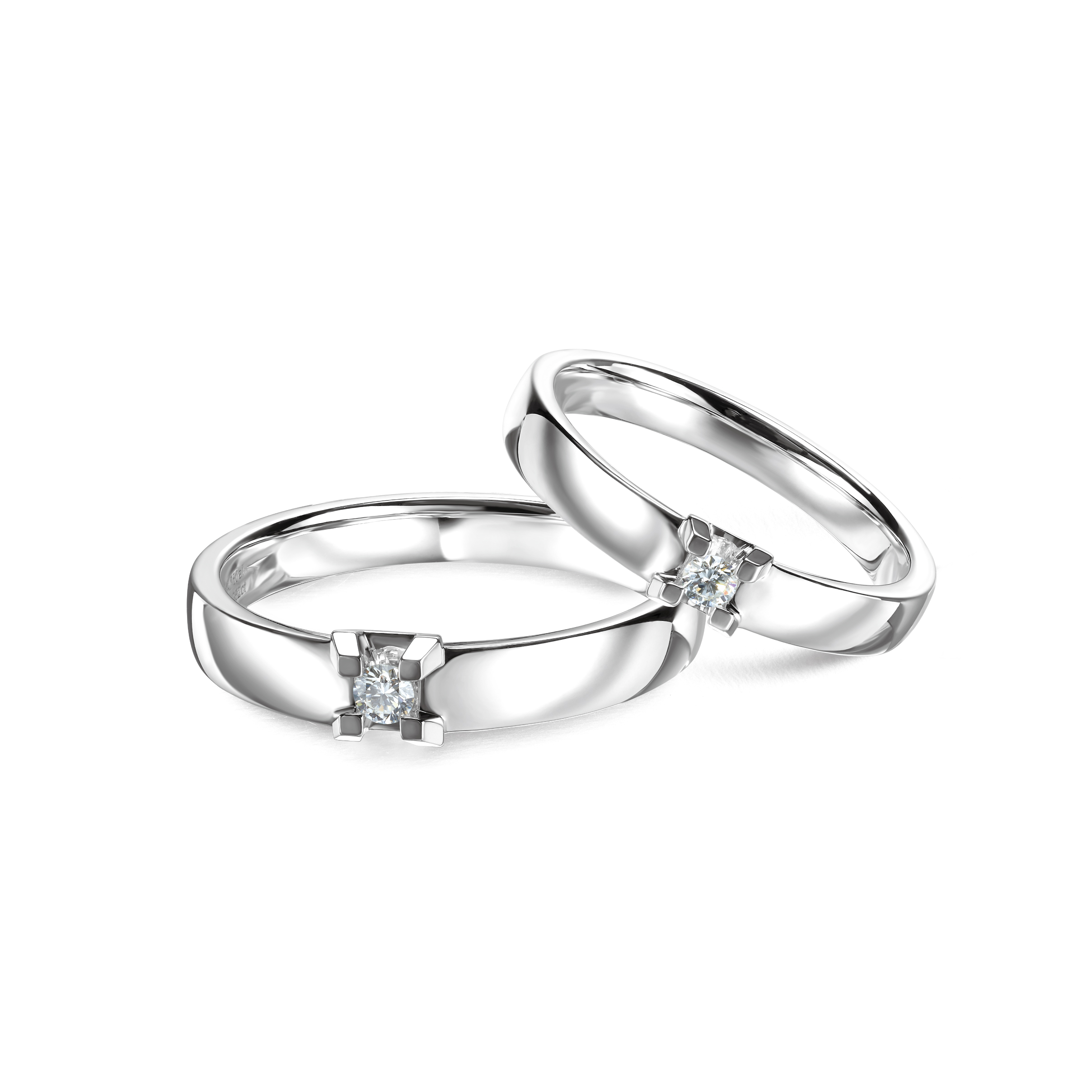 Celebrate the eternal promise of true love with these couple rings. The bands feature the classic shiny finish. The stunning centre diamond set with square prongs captures the everlasting sparkle of pure love.