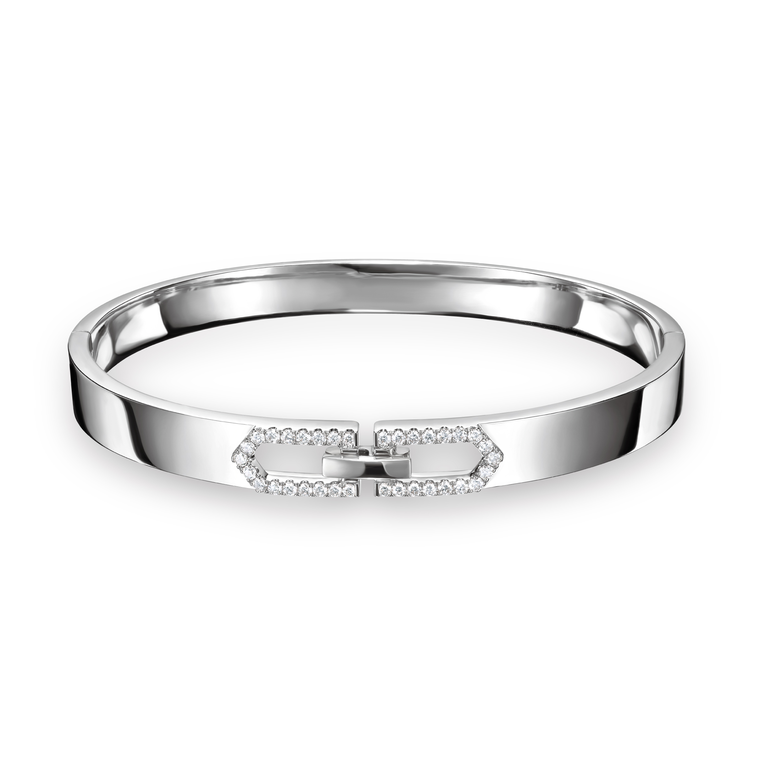 This elegant, simple bangle is accentuated by glittering diamonds and stylish hexagonal design for extra shine. 18K gold embraces the diamonds, exuding sophisticated calm and mysterious glamour.