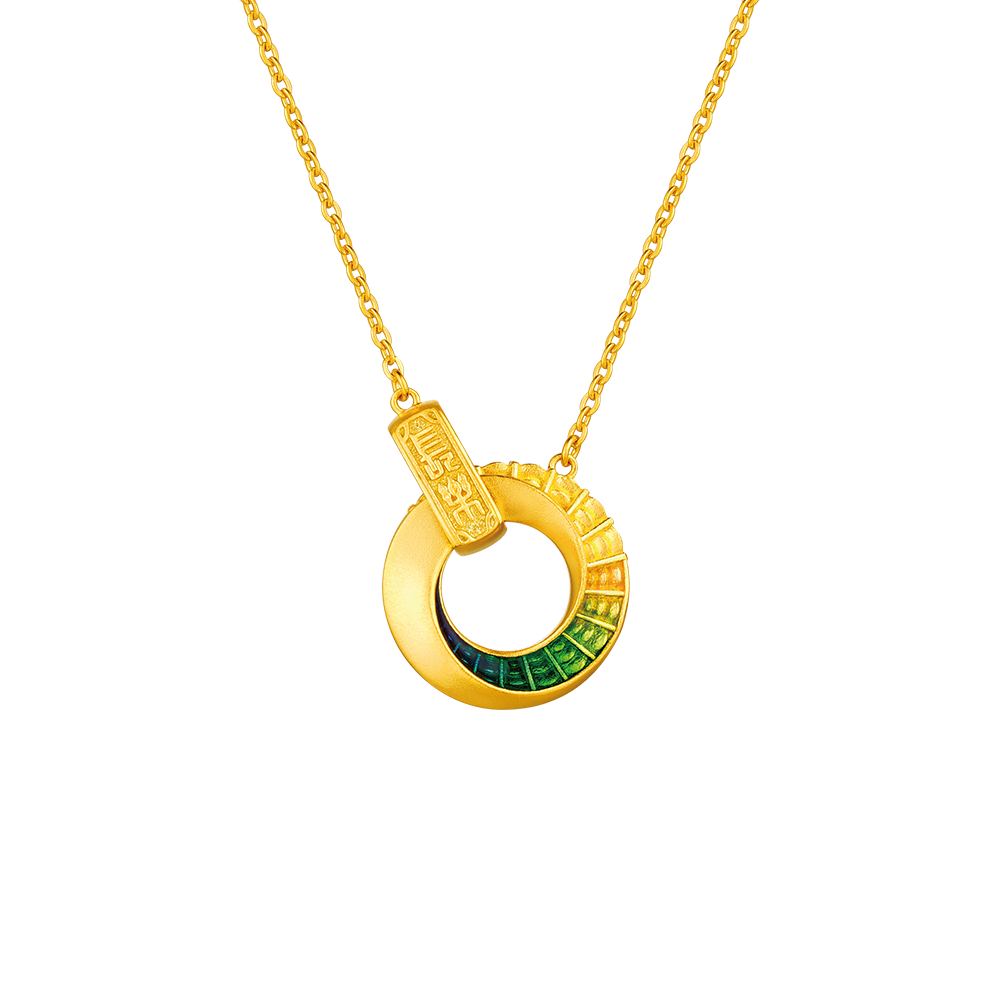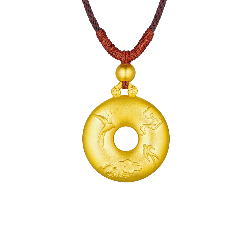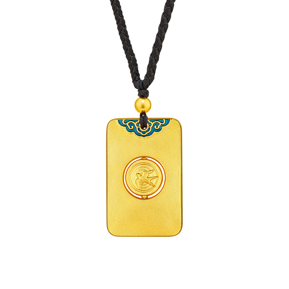 A swallow flying into your house is believed to bring luck and happiness to your family. The design takes inspiration from the eaves tile and the concept of swallow flying into the house, symbolising a happy family life. Auspicious cloud patterns are crafted with enamel. The pendant features the "fortune" characters on the front, and an openwork eaves tile in the centre depicting the swallow and the Chinese blessings for "endless happiness", signifying the best wishes for eternal joy and bliss.
