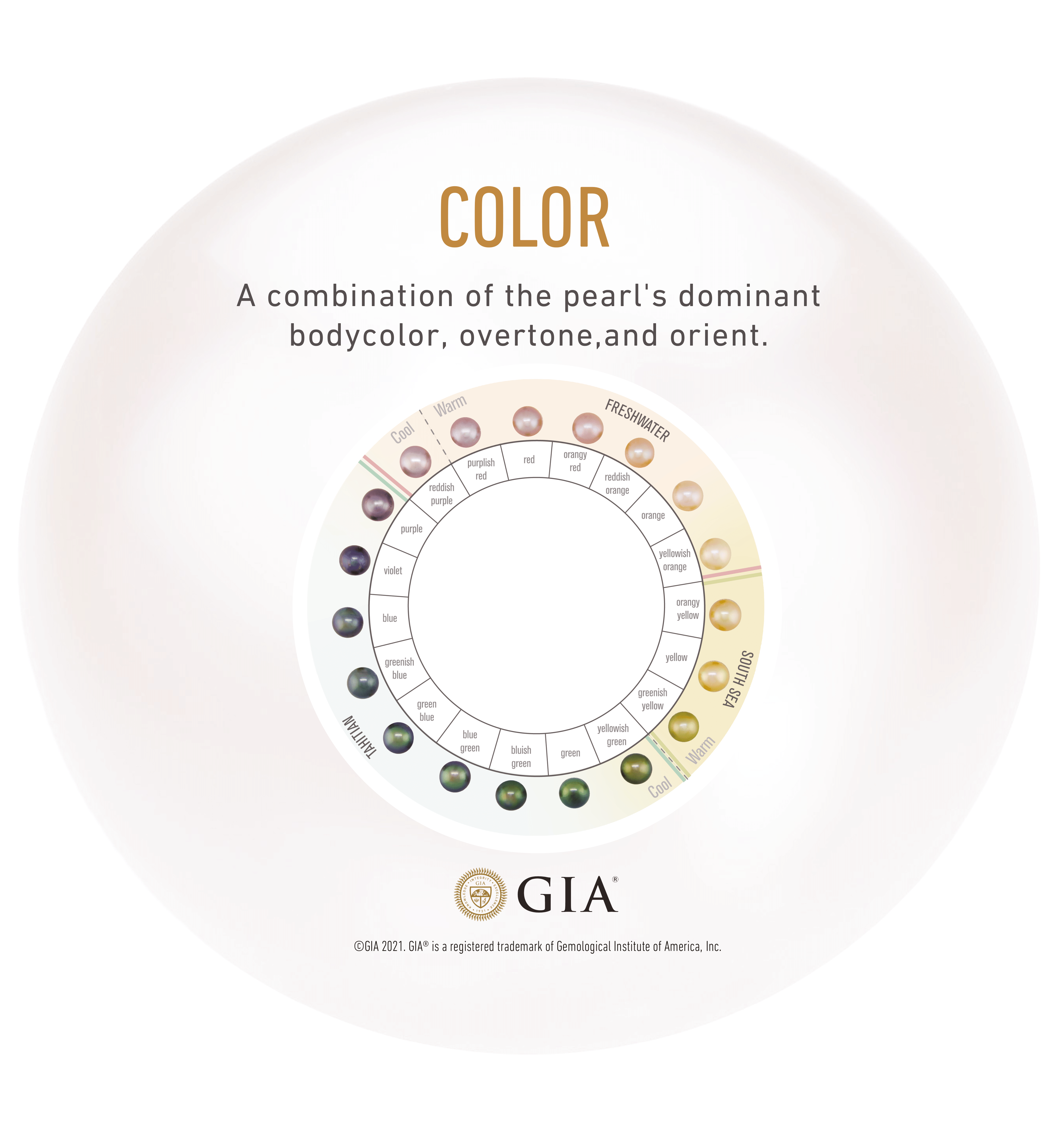 - Color: A combination of the pearl’s dominant body color, overtone, and orient.