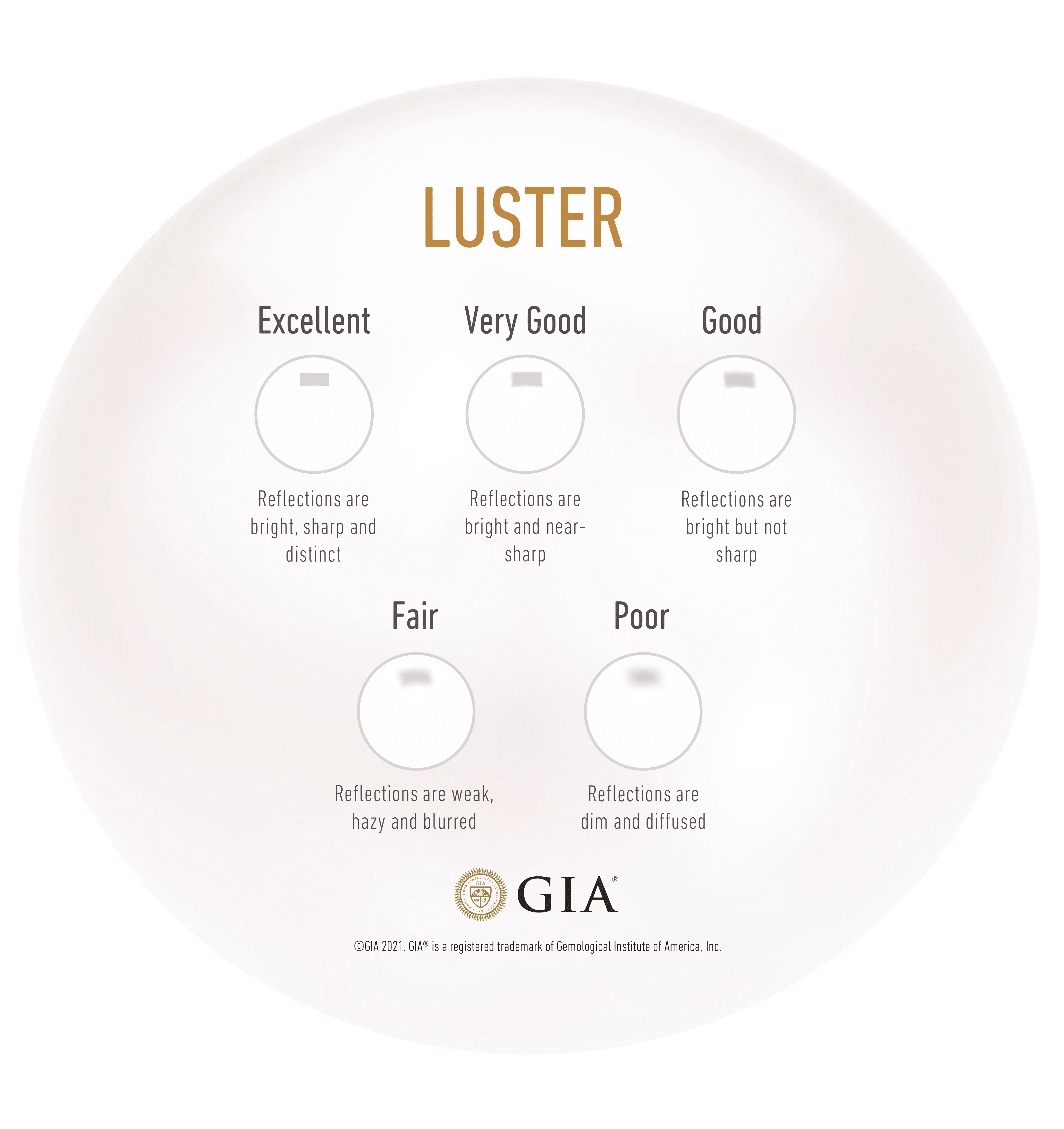 - Luster: The light reflected from or near the pearl’s surface, evaluated by the intensity and the sharpness of reflection.