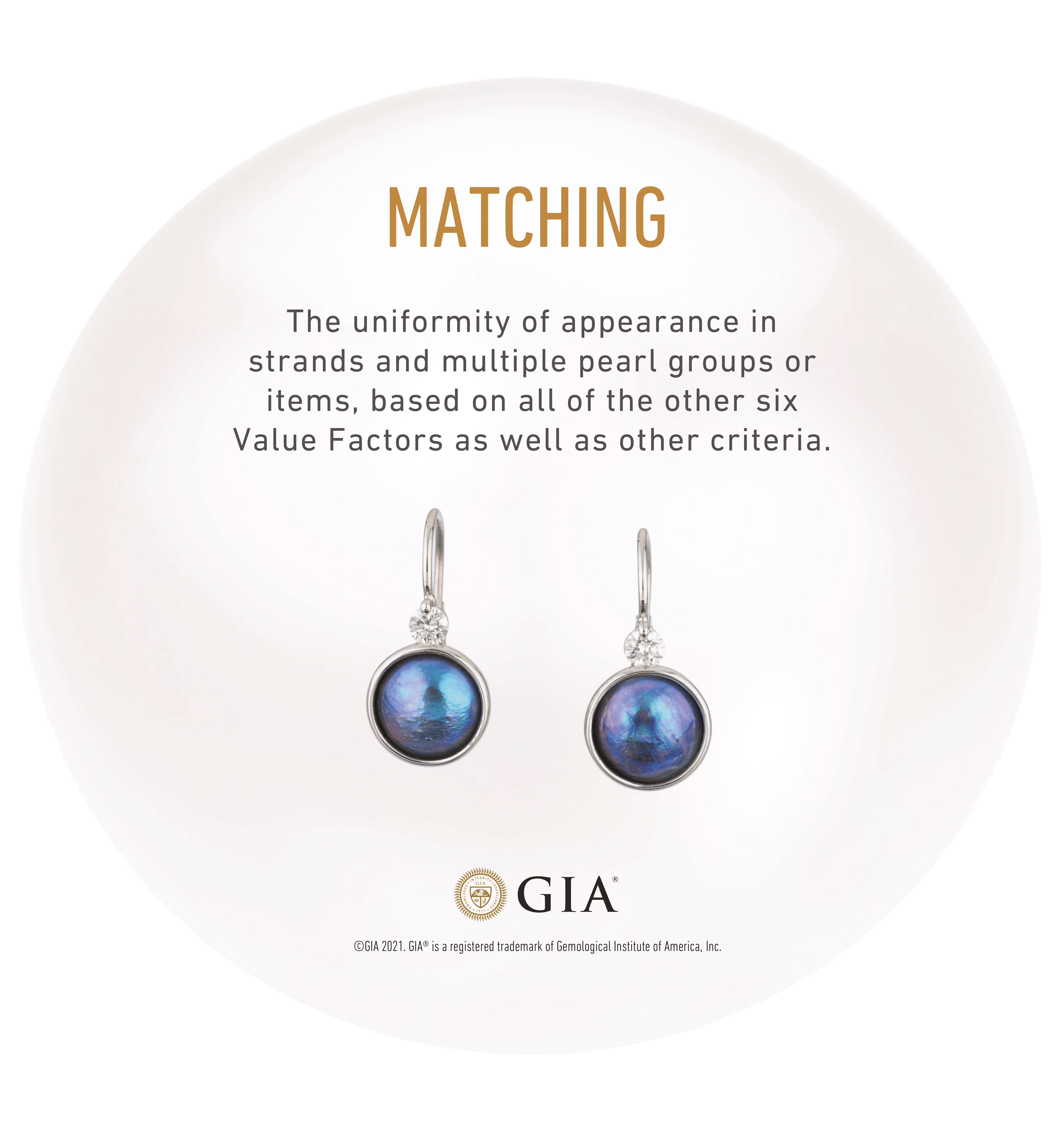 - Matching: The uniformity of appearance in strands and multiple pearl groups or items.