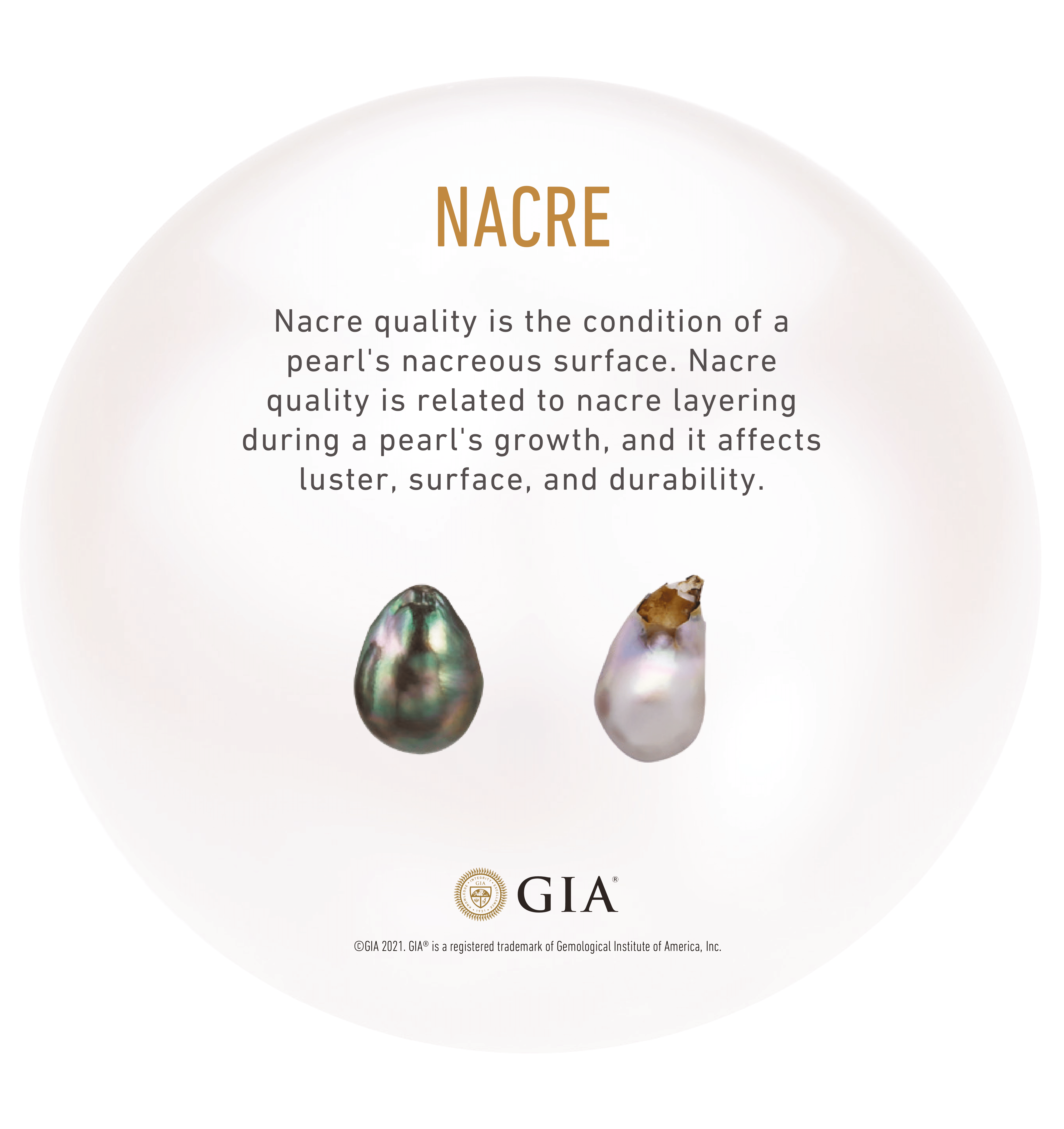 - Nacre: Nacre quality is the condition of a pearl’s nacreous surface. Nacre quality is related to nacre layering during a pearl’s growth, and it affects luster, surface, and durability.
