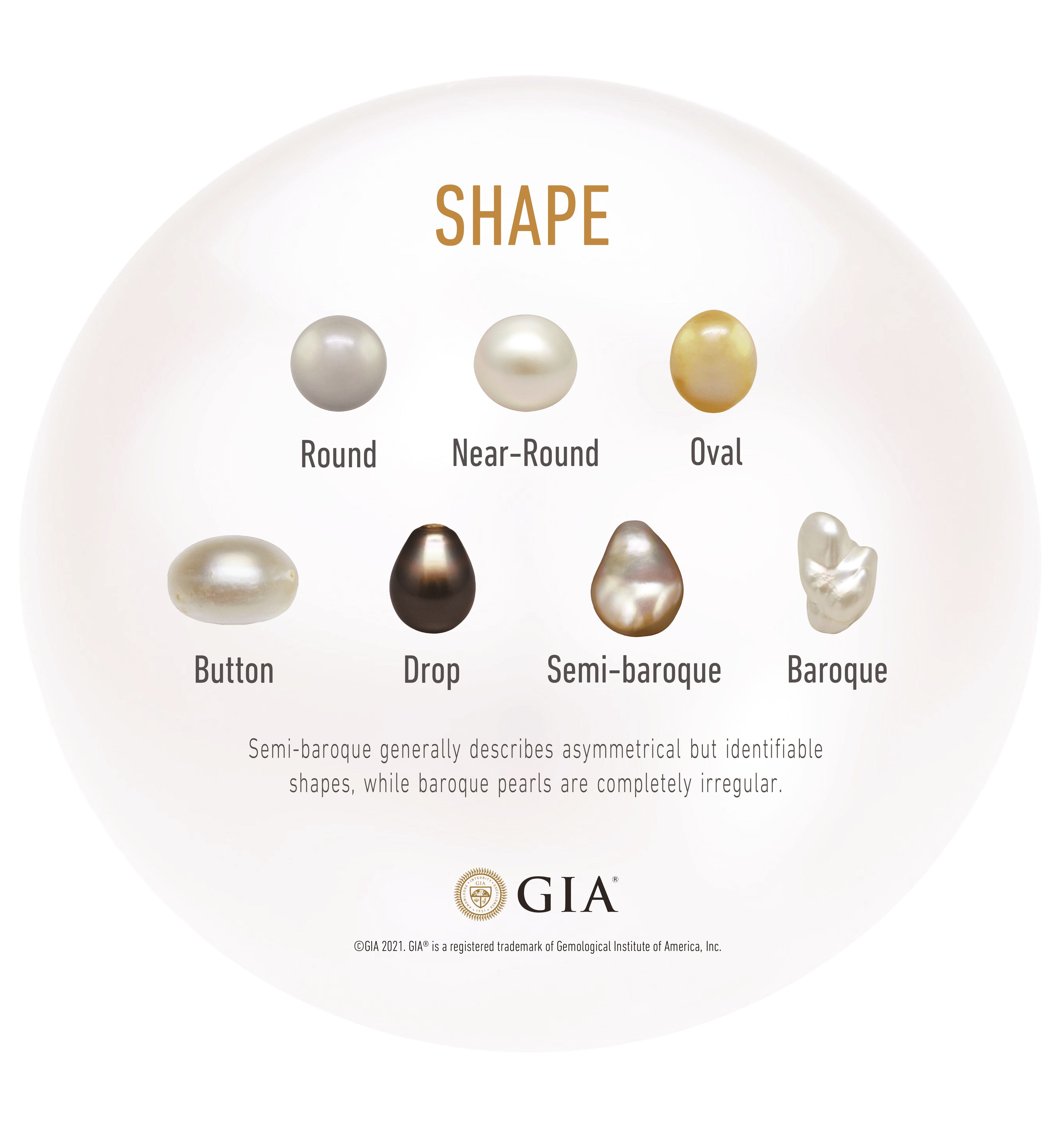 - Shape: Described as round, near-round, oval, button, drop, semi-baroque or baroque.