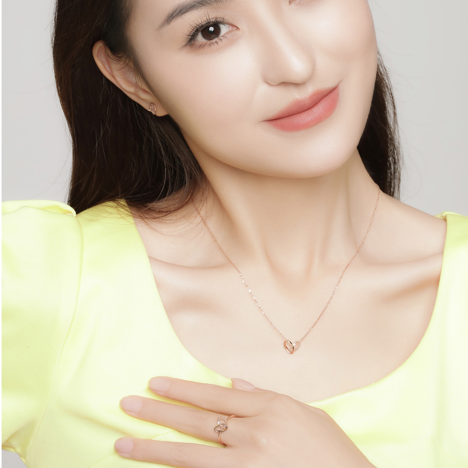 Two loving hearts close to each other capture the sweet moments in life. Cut-out hearts are fused into the necklace, ring and earrings. Brilliant diamonds catch the light in the sun with every move to bring out irresistible charm.