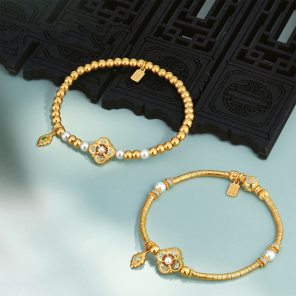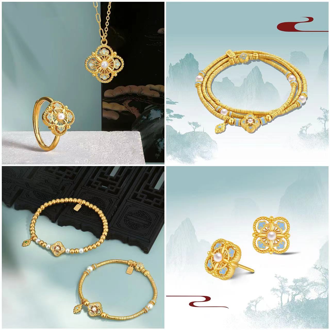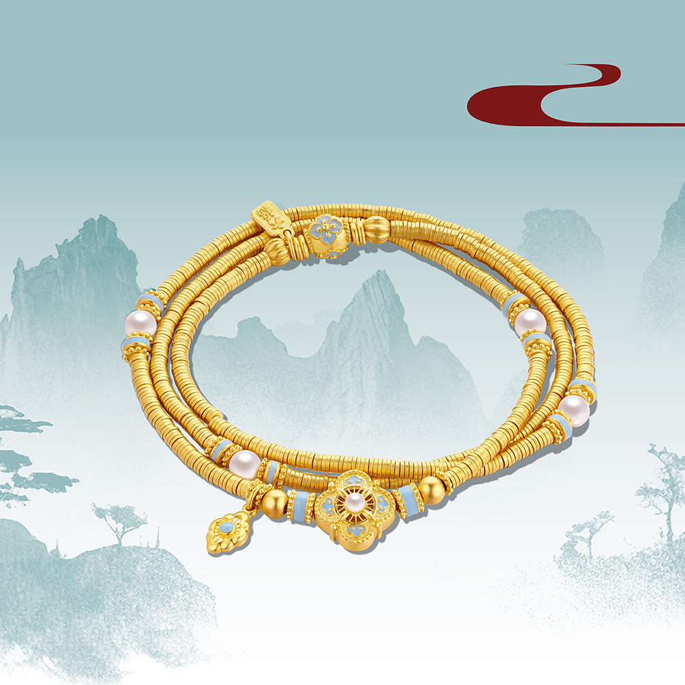 The new "Heirloom Fortune" collection gold set features a blend of the elegant persimmon pedicel pattern in Song brocades and the intricate filigree inlay art. Dazzling gold crafted with traditional skills is combined with the sky-blue enamel featuring the distinctive colour of Ru ware, and lustrous pearl to create a selection of classical yet fashionable necklaces, rings, earrings and bracelets, conveying the propitious blessings for good fortune, peace and well-being and showcasing the grace and beauty of the Song dynasty.