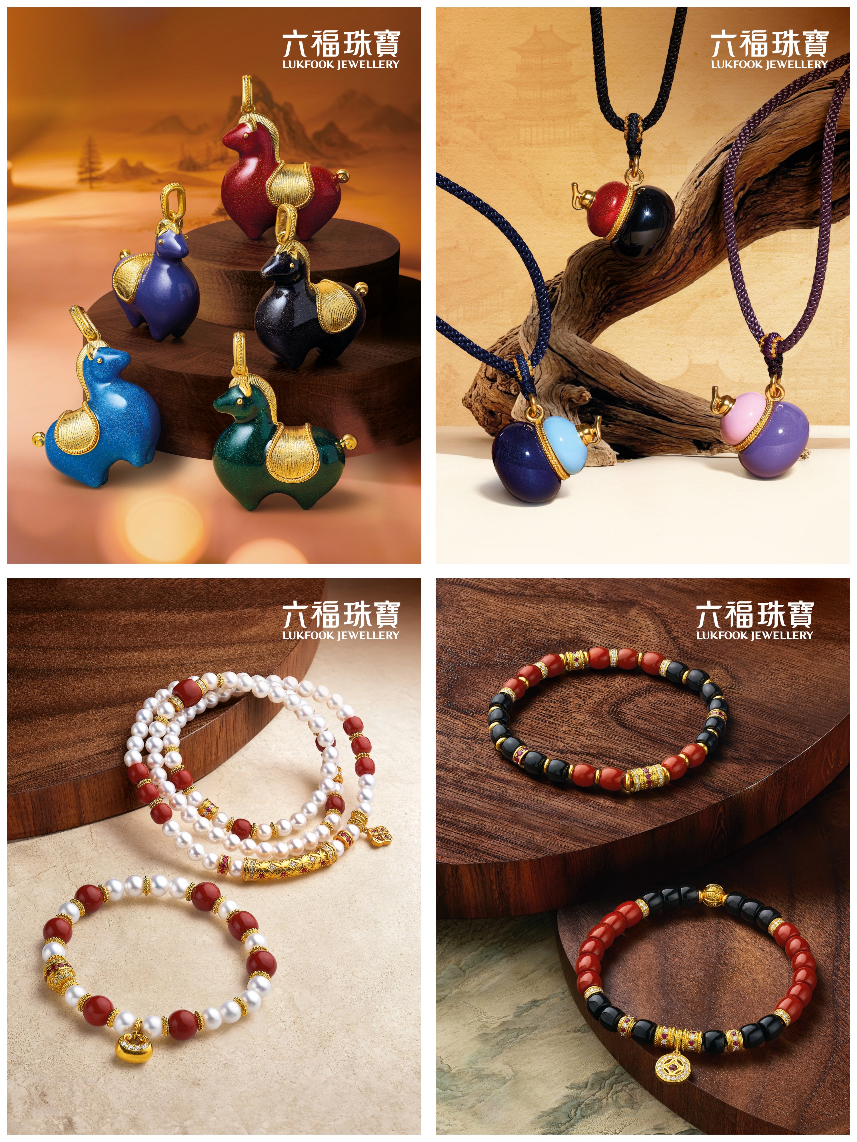 Inspired by the horses of the Tang dynasty and gourds, the "Tang Coloured Chubby Horse" and "Tang-style Gourd" gold pendants featuring a rounded form and fluid contours echo the Tang dynasty's aesthetic of "plumpness as beauty". Crafted with high-temperature enamel, these creations incorporate philosophical culture and classic Tang colour schemes, creating vibrant visual effects and transforming the millennia-old colour aesthetics into wearable blessings. Set with diamonds and rubies and paired with south red agate, black onyx, pearls and other textured gemstones, the sophisticated and elegant "Tang Colour Treasure" gold bracelets feature various auspicious elements to convey the blessings for good fortune, abundant wealth and great prosperity.