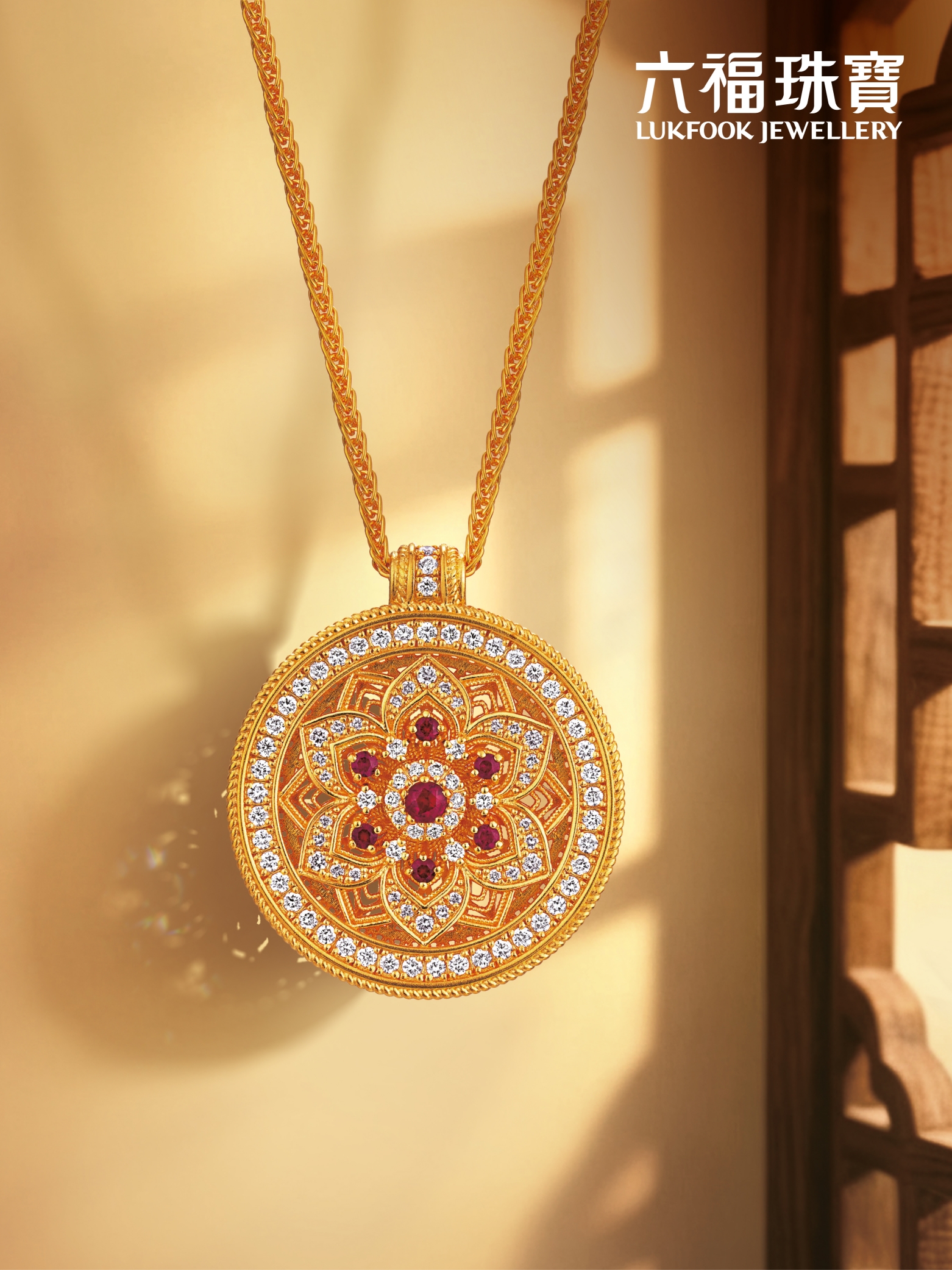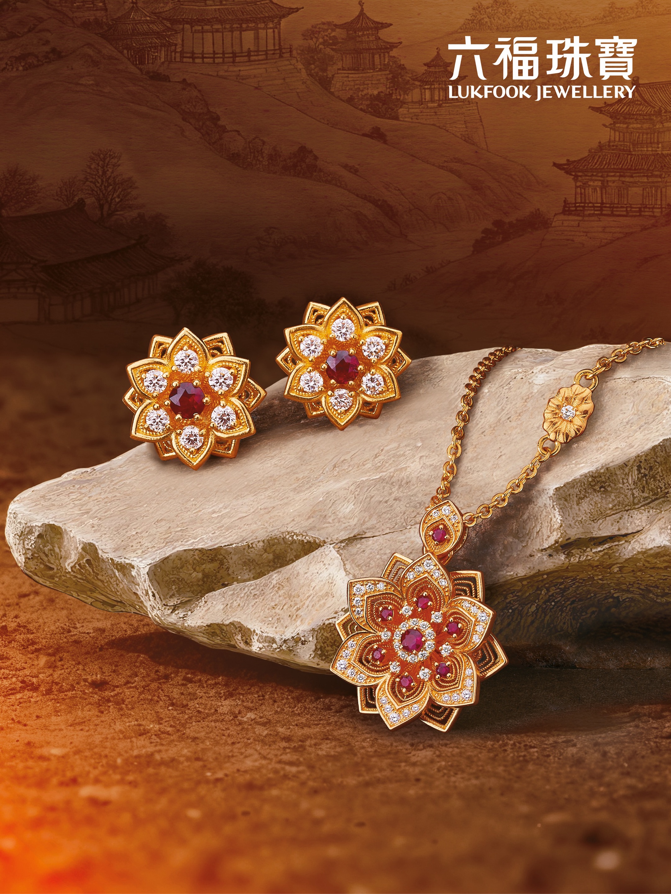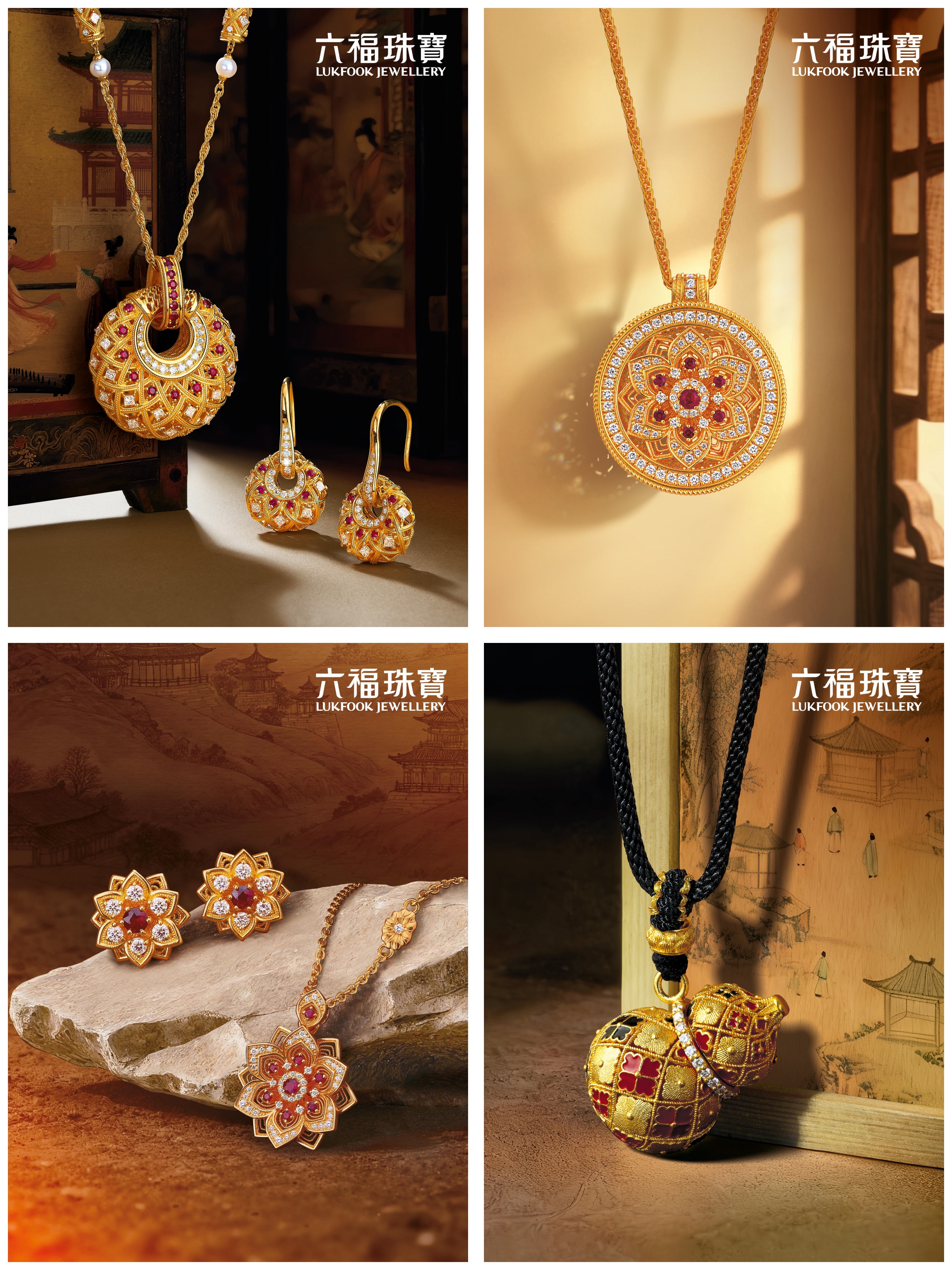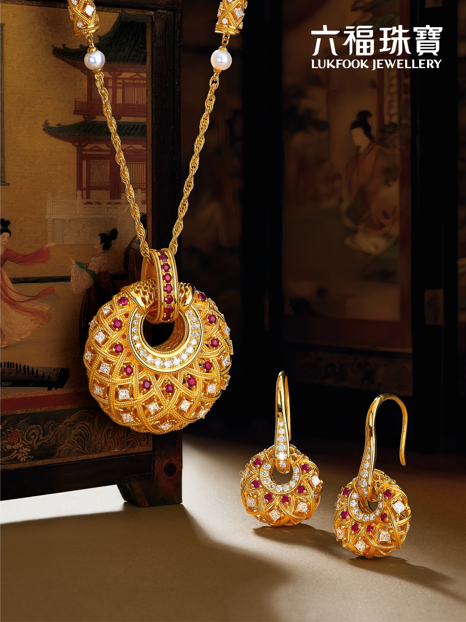 The co-branded collection by Lukfook Jewellery and "Night Banquet in Tang Palace" blends magnificent Eastern aesthetics with the cultural essence of the prosperous Tang dynasty to create finely crafted gold pieces engraved with classic patterns such as auspicious diamond-shaped floral patterns, lotus motif, and auspicious pattern featuring four ruyi motifs. Delicate filigree and intricate openwork create a visual aesthetic of ordered elegance and layered texture. The interplay of fiery rubies, natural diamonds, and iridescent colour accents radiates gorgeous lustre that echoes the rhythm of life. Featuring a combination of ancient culture, symbolic meaning and collectible value, each masterpiece exudes a distinctive style and captivating allure. Ideal for gifting or as valuable collectibles, these creations showcase your refined taste and sophisticated elegance.