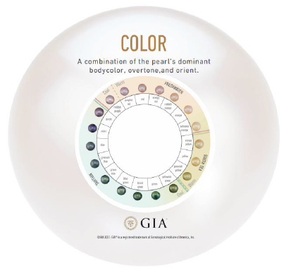 - Color: A combination of the pearl’s dominant body color, overtone, and orient.