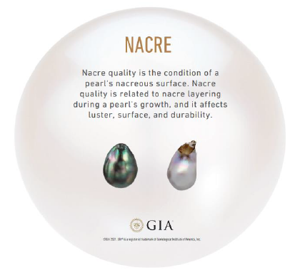 - Nacre: Nacre quality is the condition of a pearl’s nacreous surface. Nacre quality is related to nacre layering during a pearl’s growth, and it affects luster, surface, and durability.