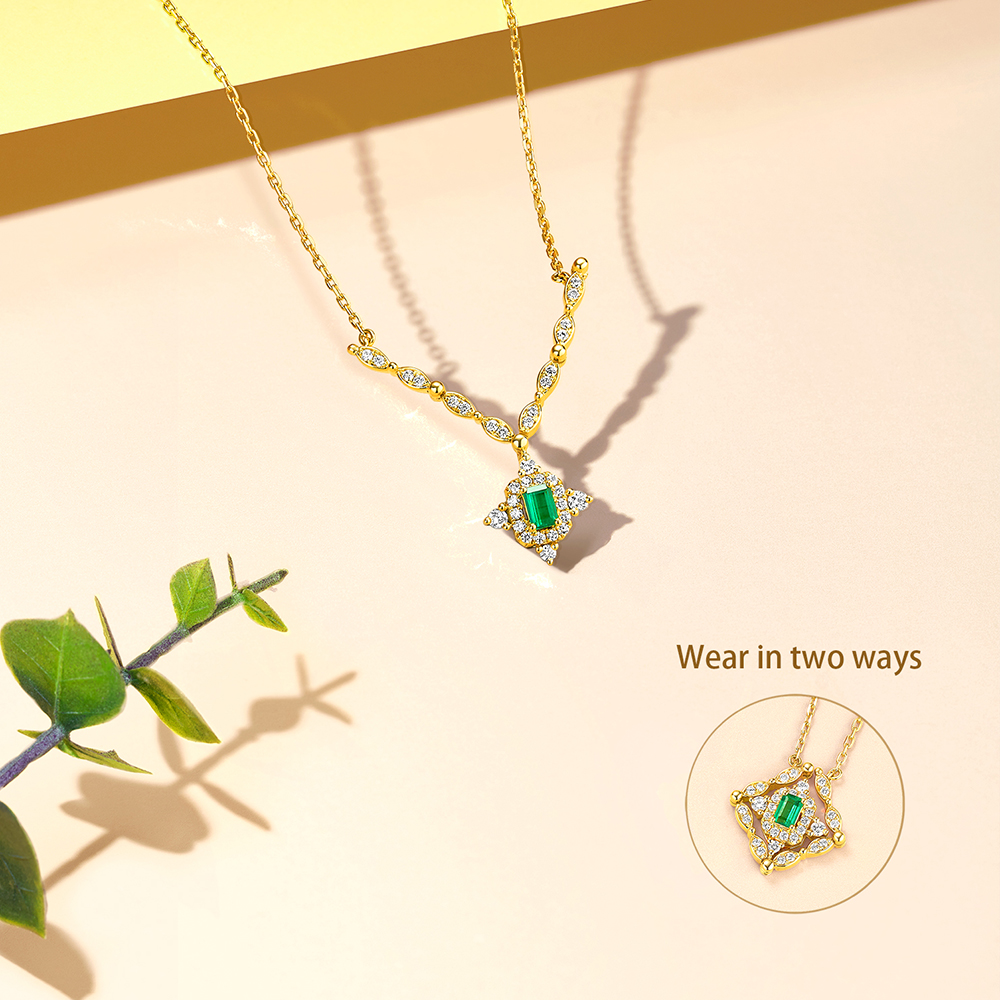The openwork design highlights the lightness and beauty. Clear emerald complements dazzling diamonds to create an elegant yet gorgeous look. The refined necklace designed with sophisticated European court patterns can be worn in two ways to suit different occasions. This selection of necklaces, rings and earrings is a romantic blend of vintage classics and modern craftsmanship.