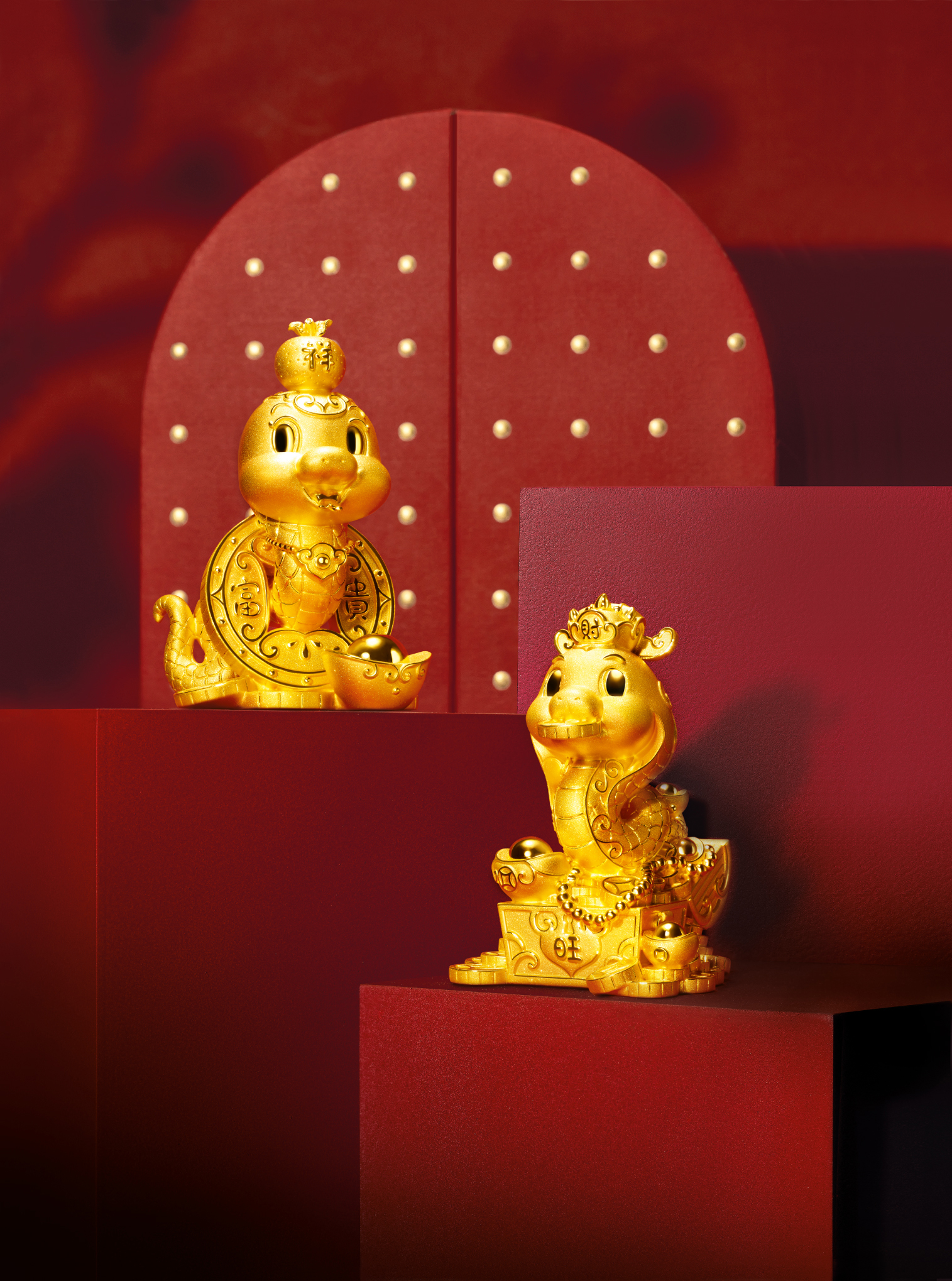 The elaborate "Auspicious Snake" gold figurines feature lifelike gold snakes gracefully coiling around treasures or winding elegantly through blooming branches, conveying good fortune. Additionally, the collection also offers a variety of symbolic pieces, including the "Auspicious Lion Dance", and "God of Wealth" accessories, as well as the "Five Auspicious Snakes" gold charms, all representing wishes for prosperity and happiness. Perfect as meaningful gifts or collectible treasures, these dazzling creations bring joy and blessings to the New Year.