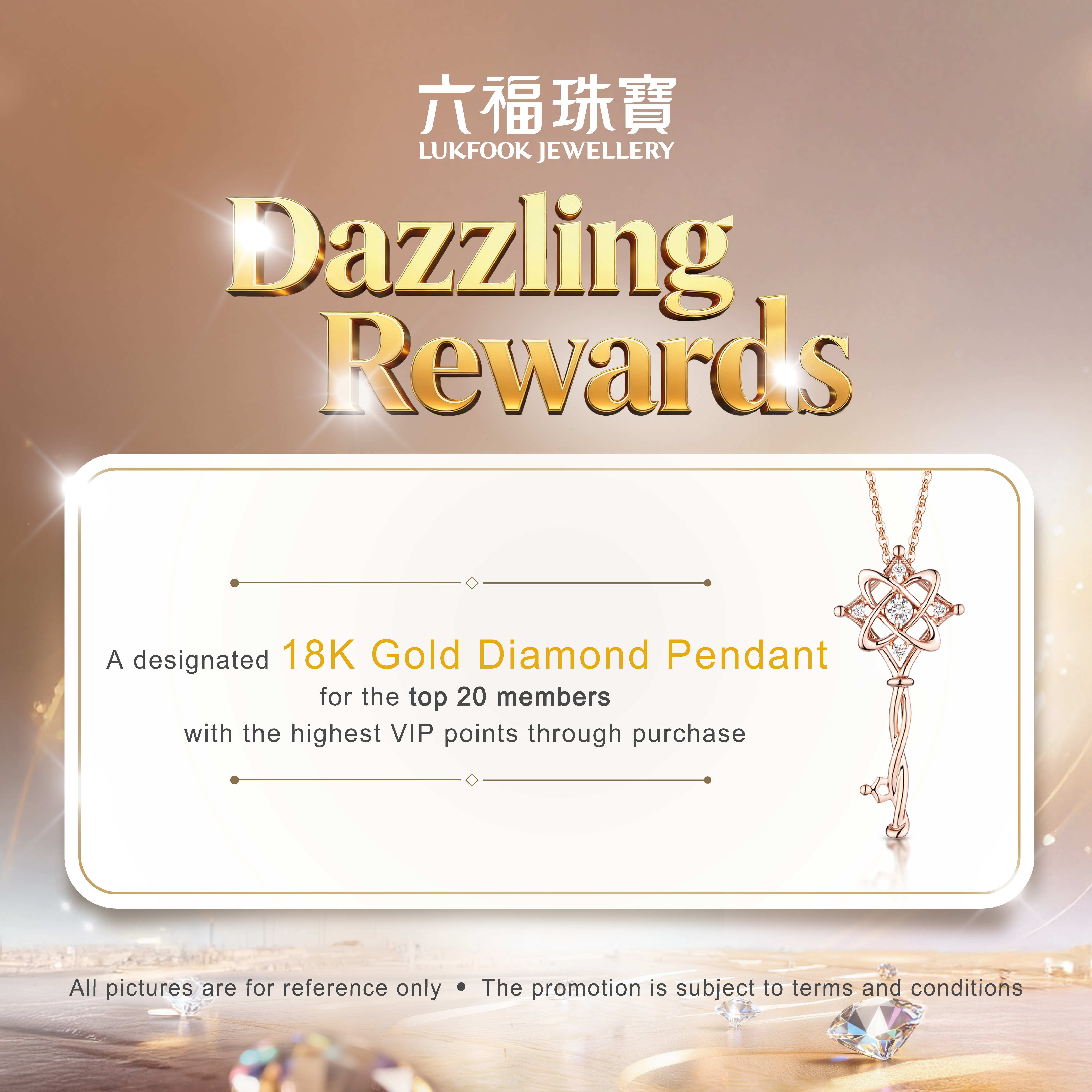 - "Dazzling Rewards" Offer: The top 20 members with the highest accumulated VIP points through transactions made at any Lukfook Jewellery physical shop worldwide within the promotion period will receive a designated 18K Gold Diamond Pendant (not applicable to transaction made in Chinese Mainland, bonus points from purchases during birthday and special promotions); No subsequent entry of points will be entertained; The qualification will be based on the total VIP points accumulated from transaction of members at the end of the promotion period, and the transaction must be taken place in any Lukfook Jewellery physical shop worldwide (not applicable to Chinese Mainland). Calculations are based on the system records of Lukfook Group (“the Group”); In the event that a member cancels any transaction and the points earned are deducted, the latest system record shall prevail; A representative will contact eligible winners individually for prize collection arrangement in May 2026. All winners must collect their prizes in person at a shop of their choice (not applicable to Chinese Mainland). Failure to collect the prize by the deadline will be deemed as forfeited.