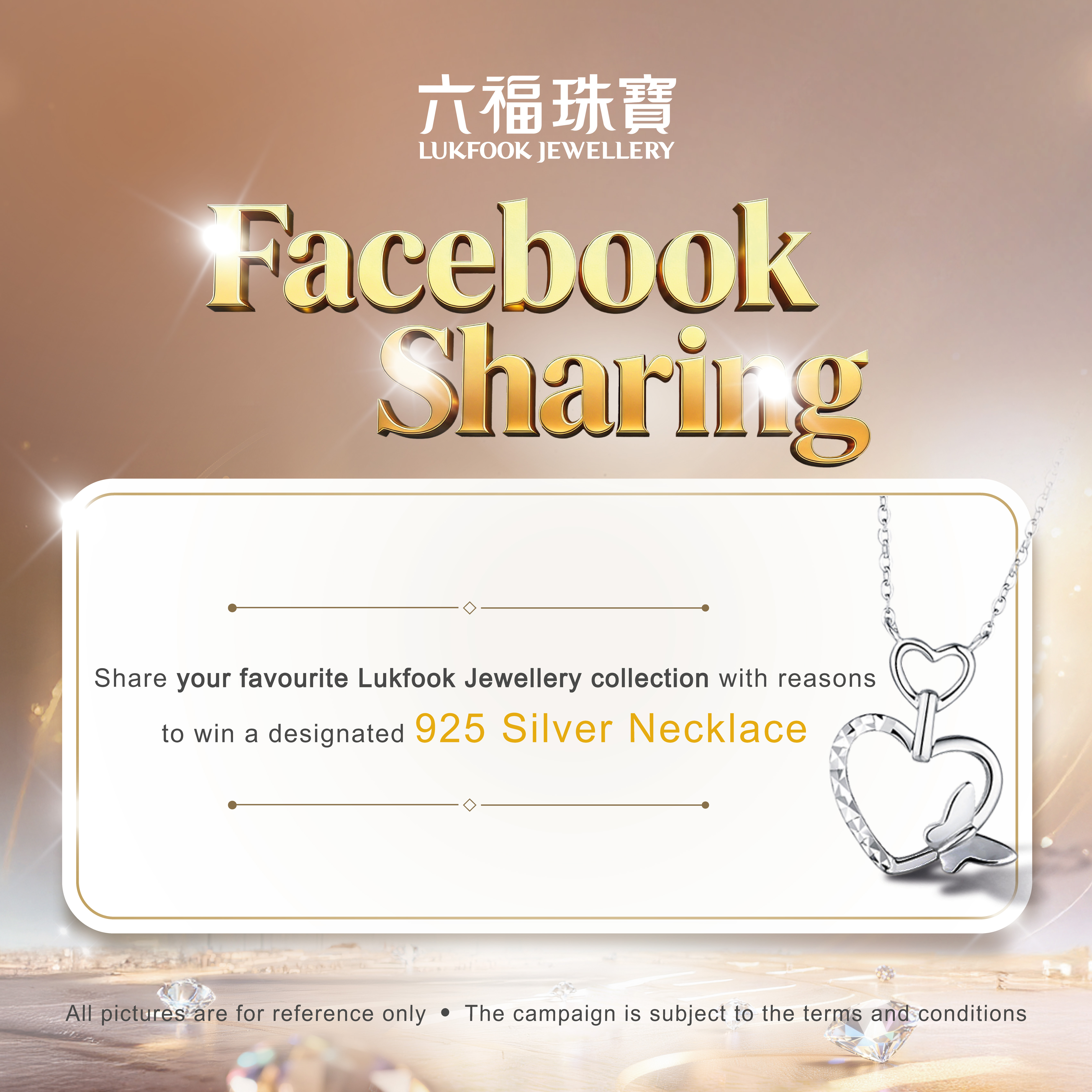 Join the Facebook game to win a designated 925 Silver Necklace. For details, please refer to the post on 26 March,2026 at Lukfook Jewellery Official Facebook page