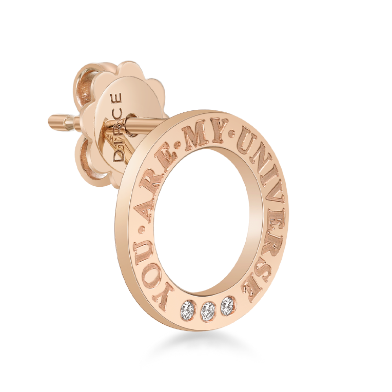 The 18K rose gold Orbite diamond Studs takes the simple symbol of the circle and adds to it a declaration: "You Are My Universe", where the engraving is highly precise. The 3 diamonds on the Orbite symbolize the DIRCE 3 pillars.