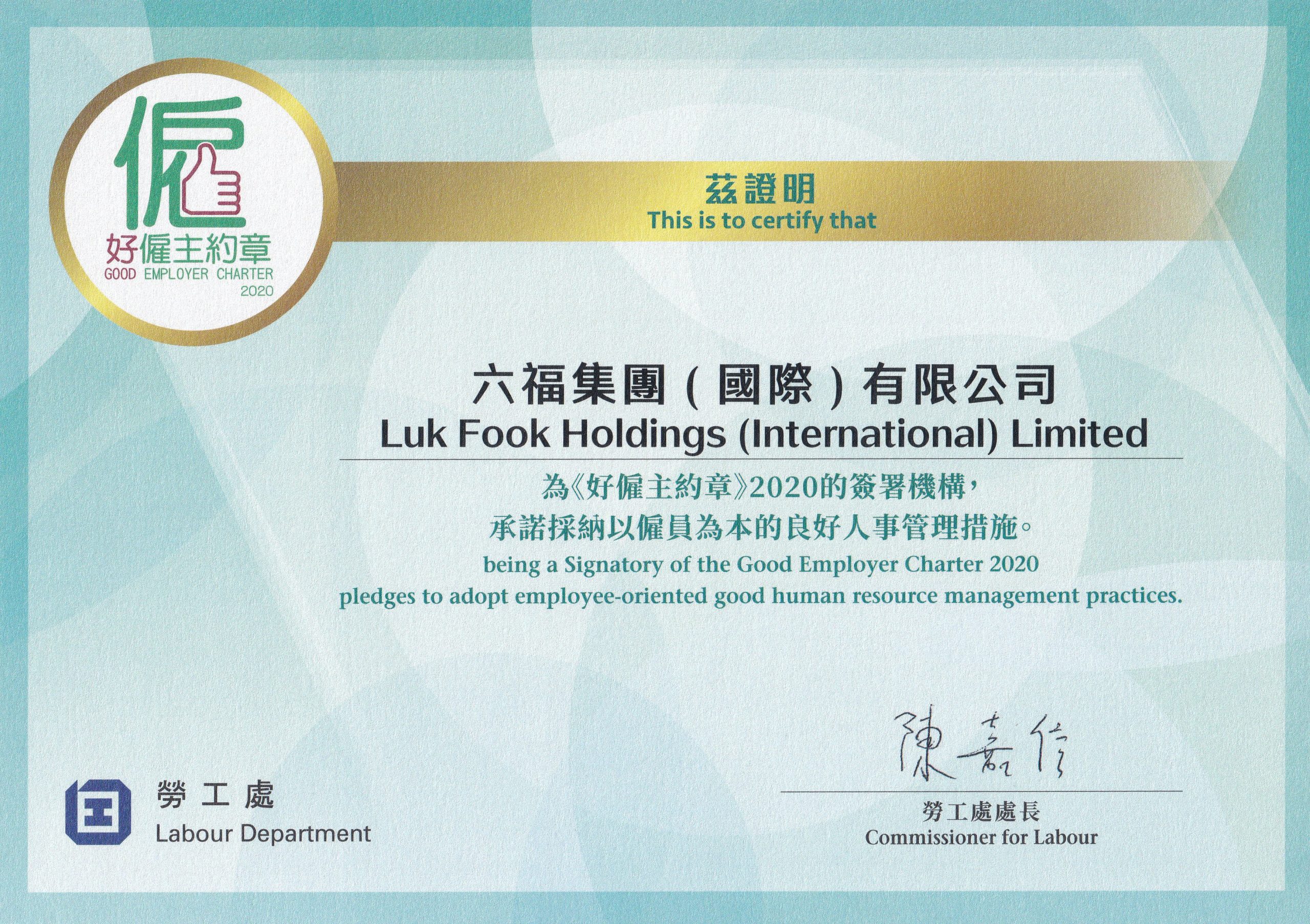 (2020年10月22日) ── 六福集团(国际)有限公司(「六福」/「集团」)(股份代号:00590)欣然宣布集团成为《好雇主约章》的签署机构,并获颁发参与《好雇主约章》证书,以嘉许集团秉承以雇员为本,及在实行良好人事管理措施上之突出成果。