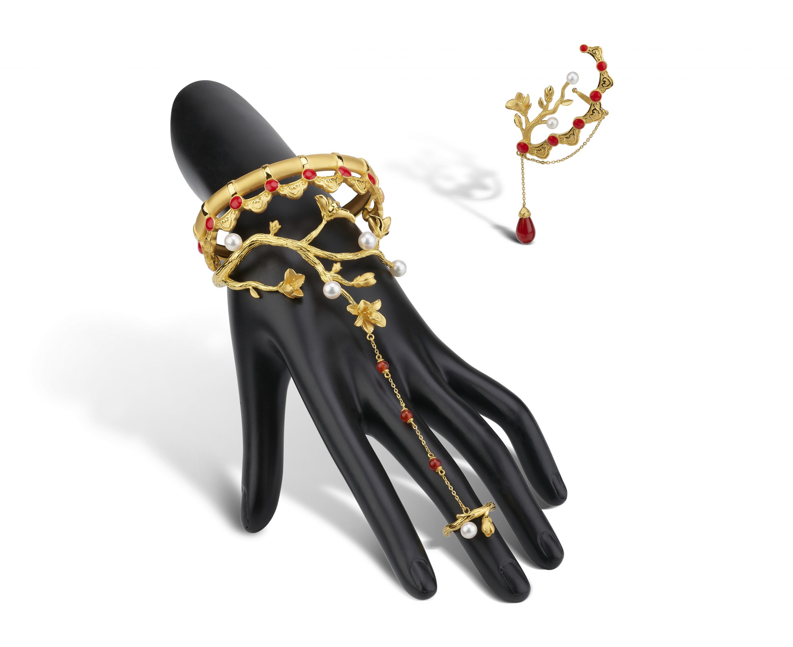组别:公开组 作品:「红墙映兰」 饰品包括:手镯及耳环 获奖设计师:高级珠宝设计师王文婧小姐 设计概念 紫禁城里华丽壮观的红墙金瓦点缀着冰清玉洁的玉兰花,春意盎然,繁华春光中的紫禁城令人着迷。红墙映衬着白花是紫禁城里古典唯美的历史,也是愉悦的视觉享受。 |