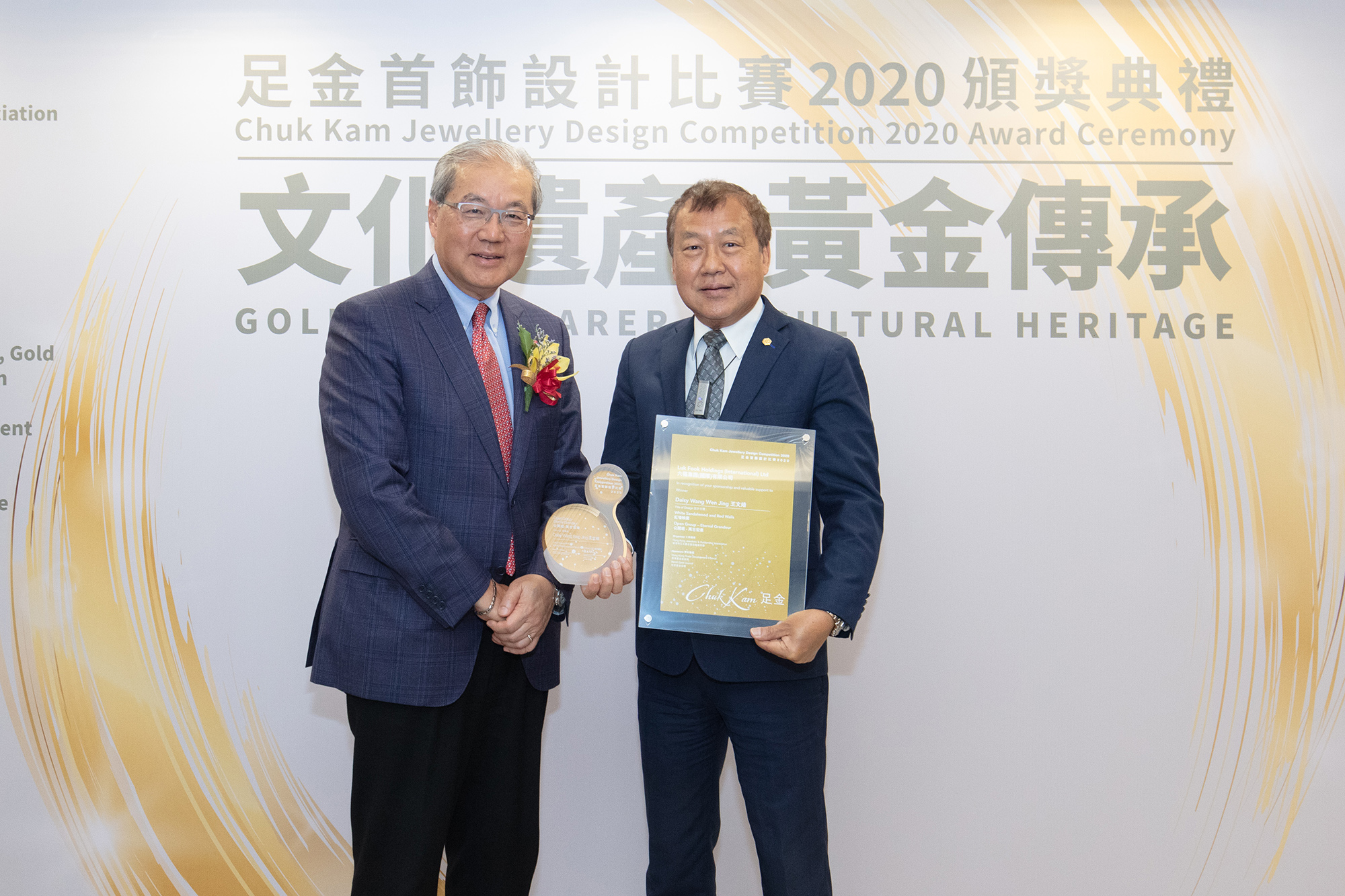 六福集团副主席兼副总经理谢满全先生(右)代表得奬设计师王文婧小姐接受香港贸易发展局香港国际珠宝展筹委会主席及香港钻石总会创会会长马墉宜先生(左)颁发奖项 |