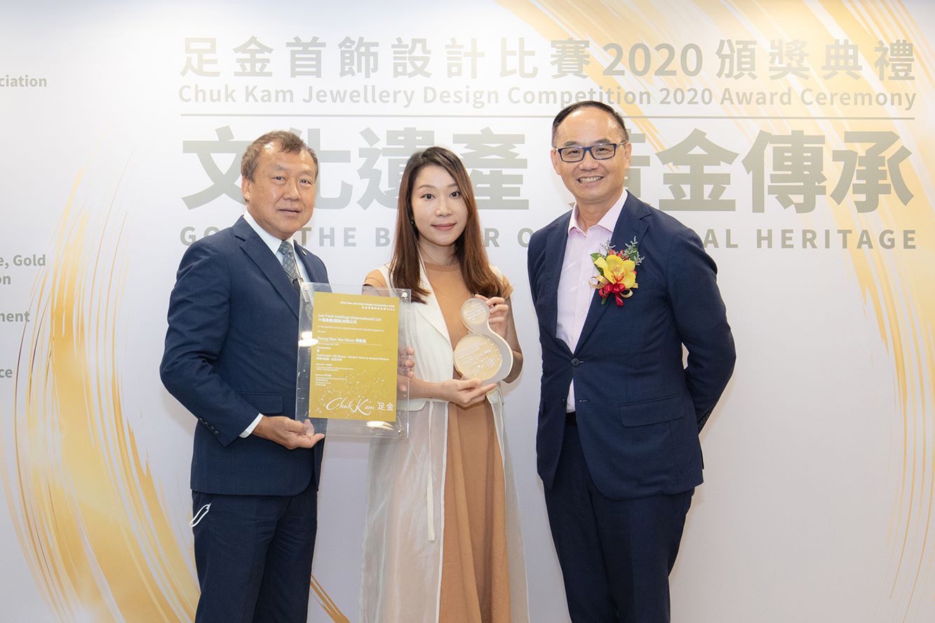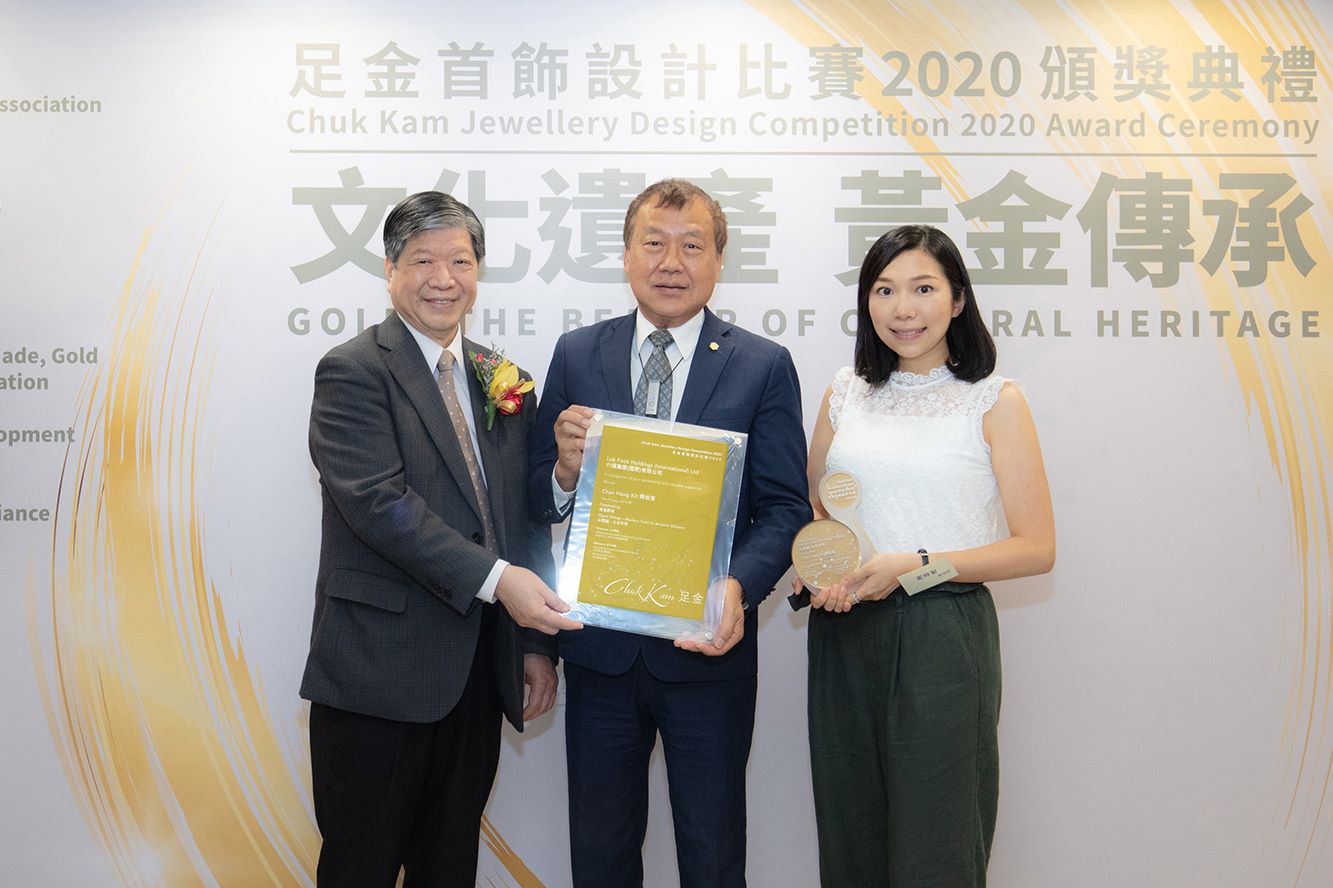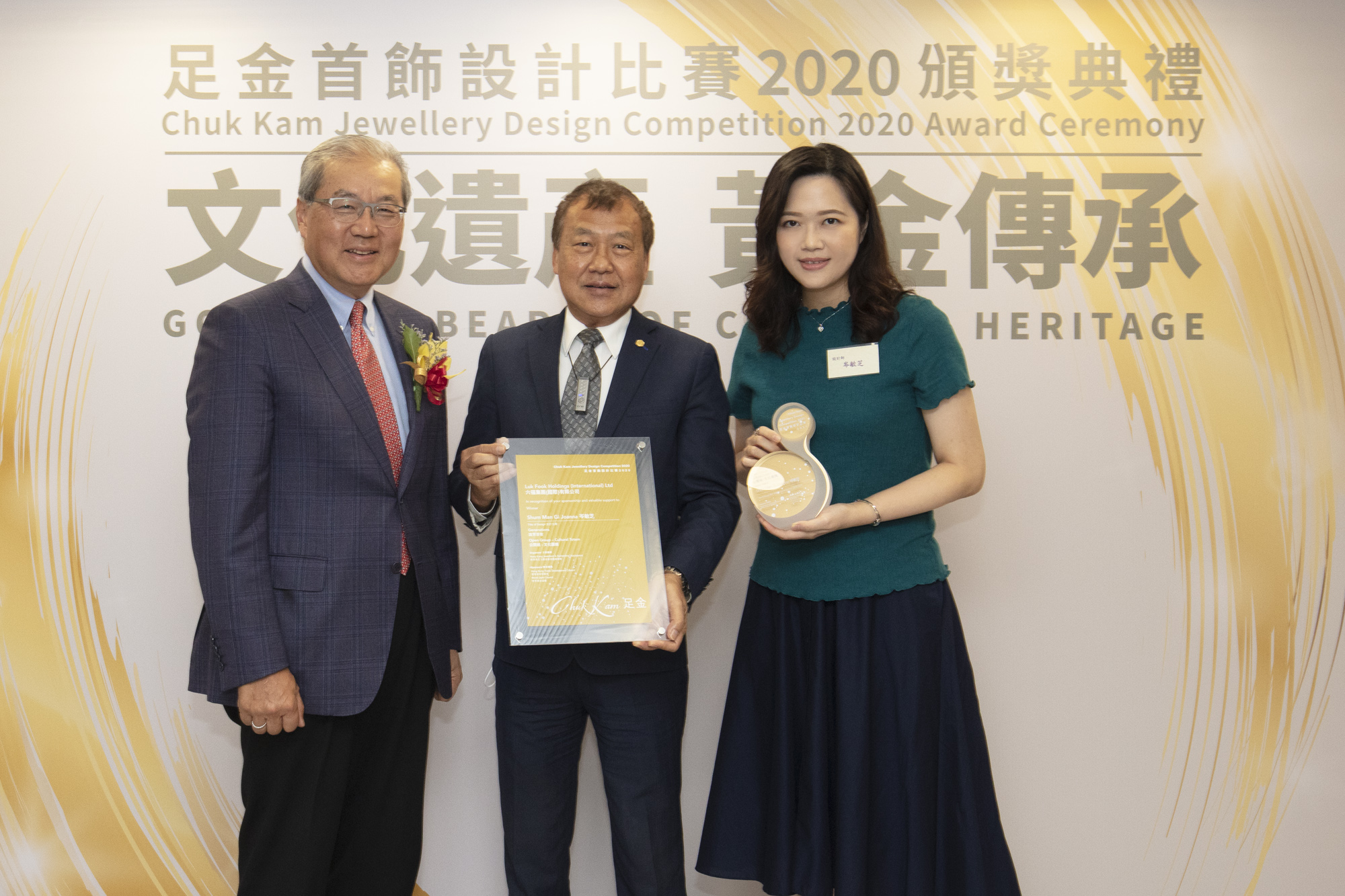 六福集团副主席兼副总经理谢满全先生(左)及得奬设计师杨敏义小姐(中) 接受香港珠石玉器金银首饰业商会理事长黄绍基先生先生(左)颁发奖项 |