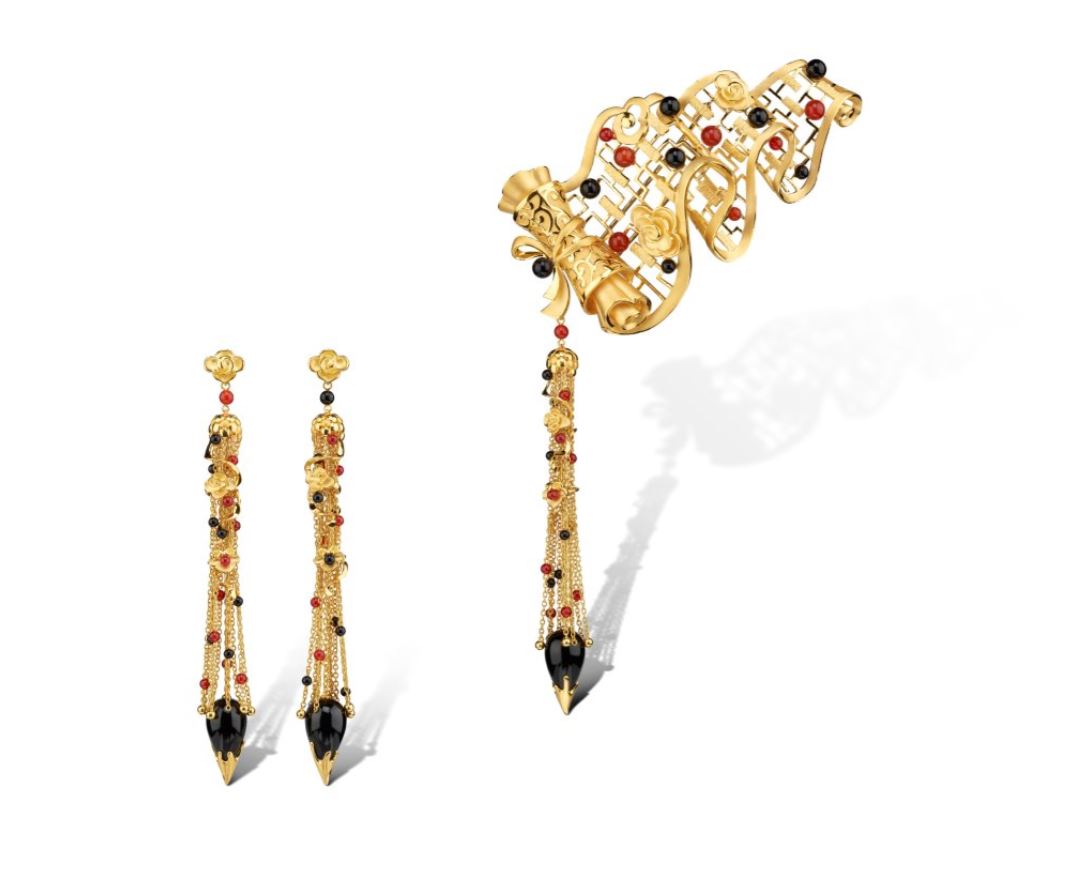 组别:公开组 作品:「流芳百世」 饰品包括:襟针及耳环 获奖设计师:高级珠宝设计主任岑敏芝小姐 设计概念 古人以中国文房四宝中的纸、笔、墨编制传世族谱,紧密连系着我们彼此的血脉,随时光流逝、历史变迁,族谱成为珍贵的宝藏世代传承、流芳百世,缔造辉煌的历史见证。 |