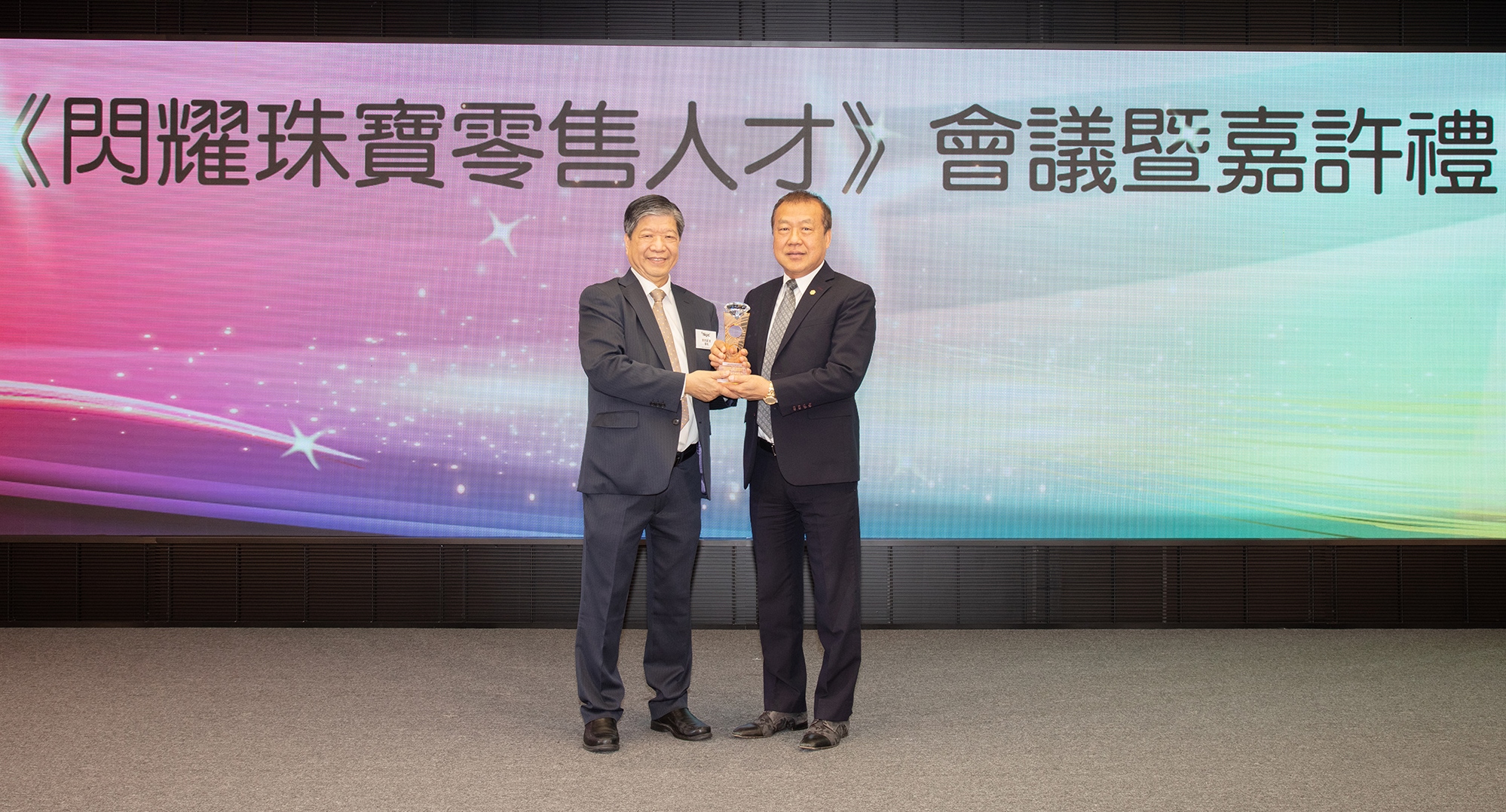 六福集团副主席兼副总经理谢满全先生(右)在《闪耀珠宝零售人才》会议暨嘉许礼中接过九龙珠石玉器金银首饰业商会理事长刘克斌先生(左)颁发之「最踊跃参与网上电子课程机构」奖座