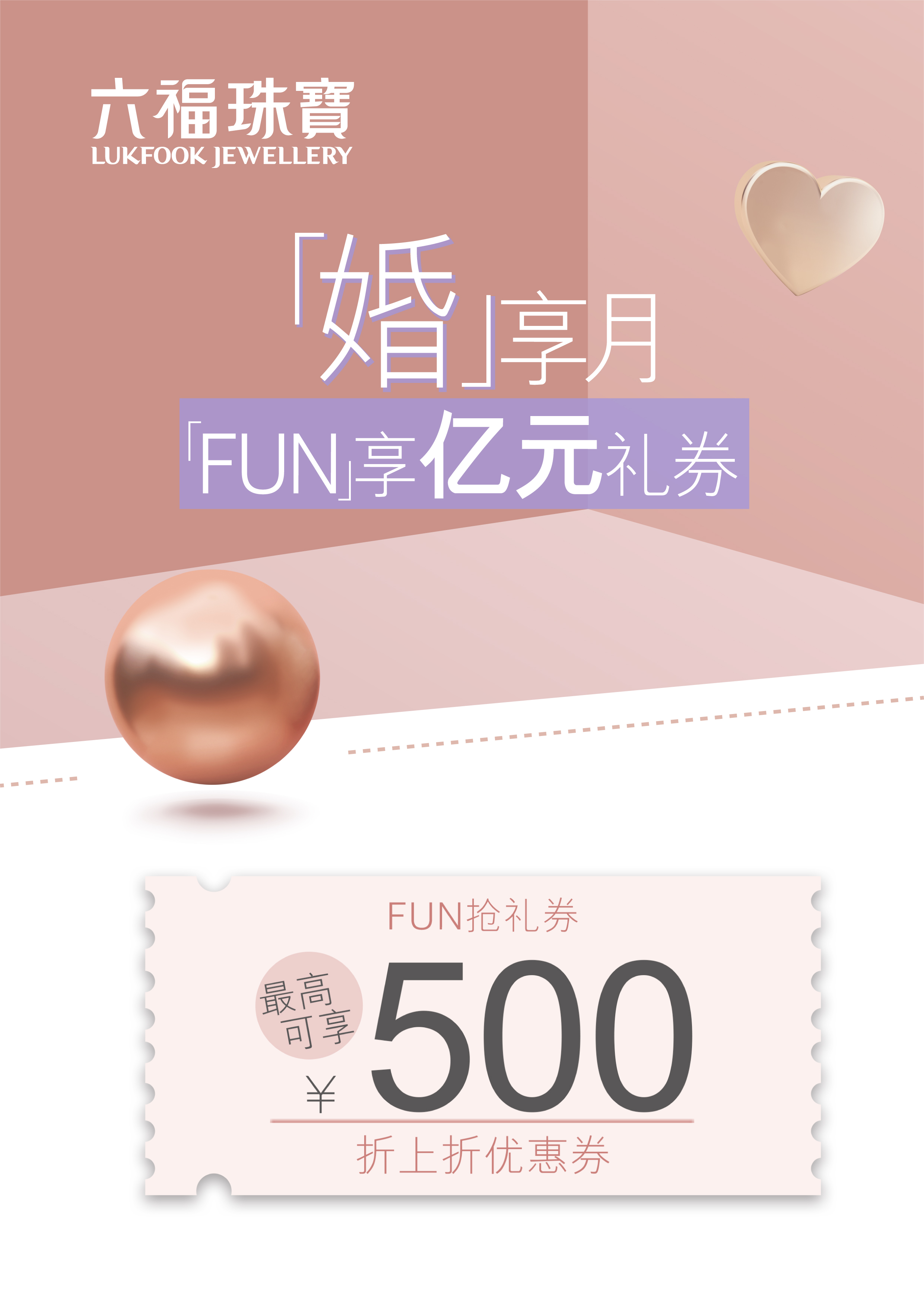 (2020年4月29日) ——五一劳动节、母亲节、“5·20”以及六一儿童节接踵而至,恰逢六福珠宝「婚」享月,实力开启大型宠粉模式:5月1日至6月1日将于中国内地各分店推出“「婚」享月-「FUN」享亿元礼券”活动,通过微信小程序发放总值逾1亿元的折上折优惠券,期间还有更多重磅福利,精明的你赶紧解锁这份省下一个亿的攻略吧!
